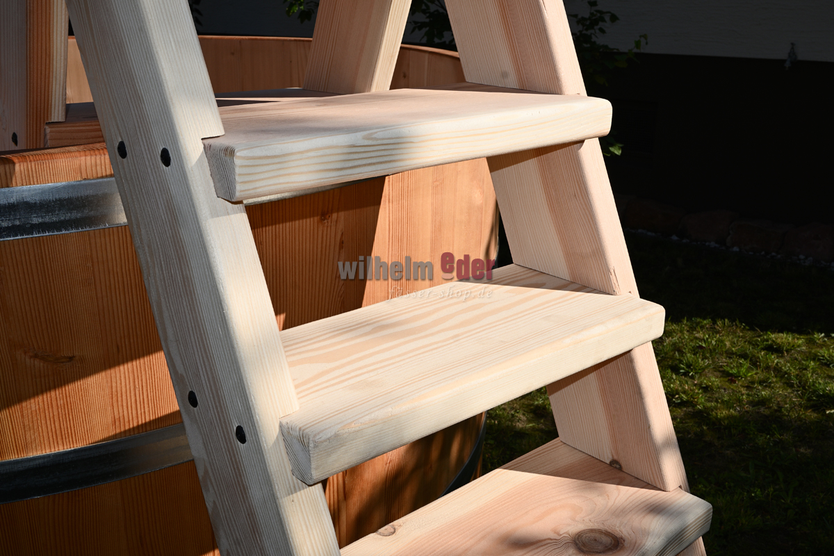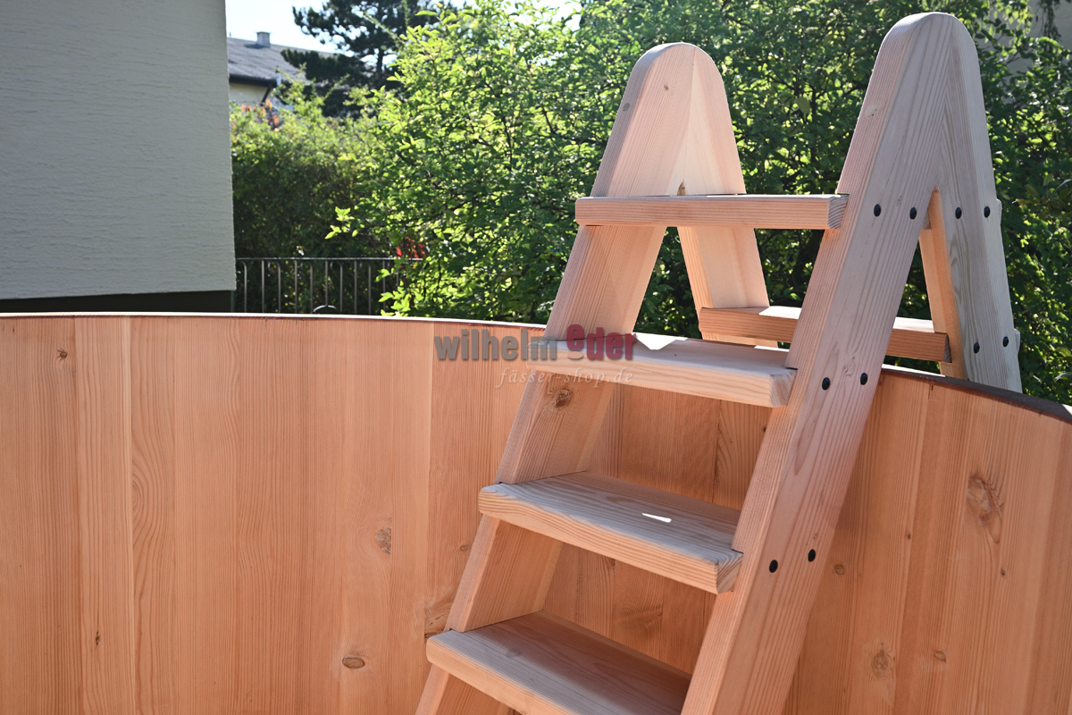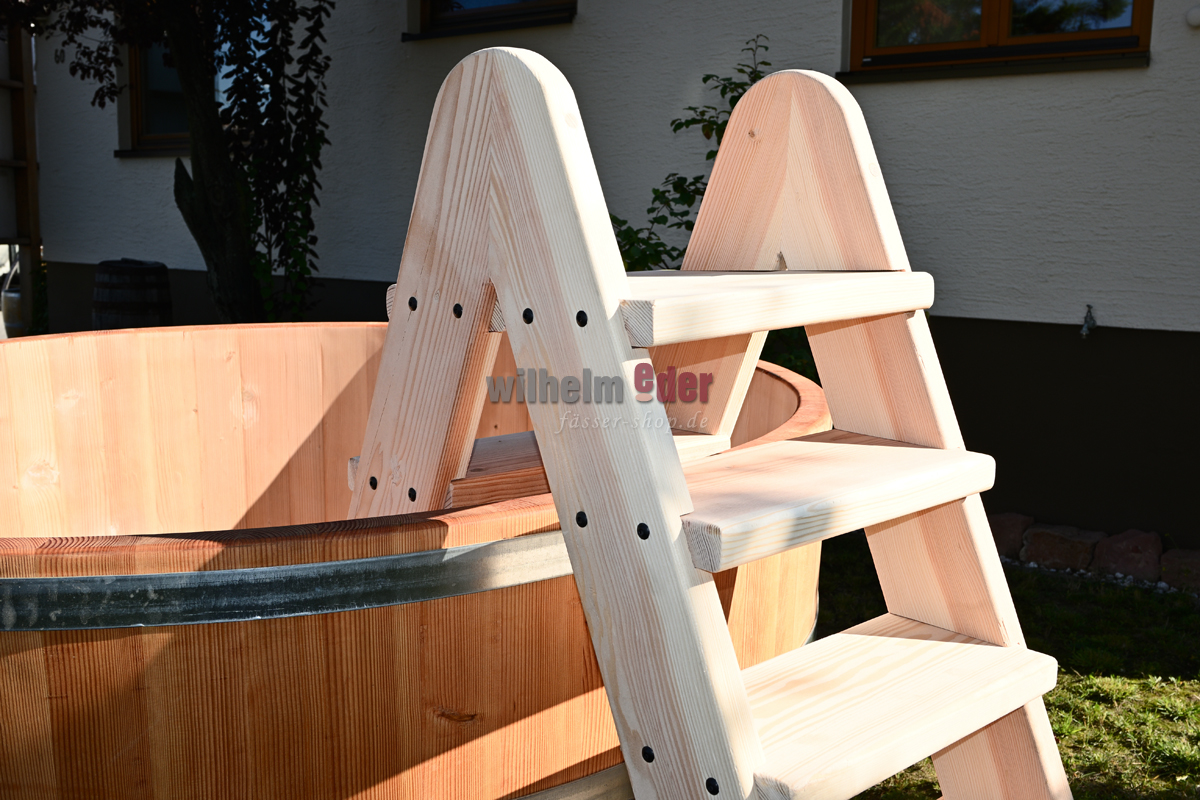Passend zu Ihrem Badefass fertigen wir in unserer Schreinerei eine Leiter aus luftgetrocknetem Douglasienholz zum erleichterten Ein- und Austeigen.