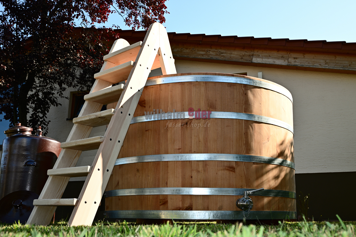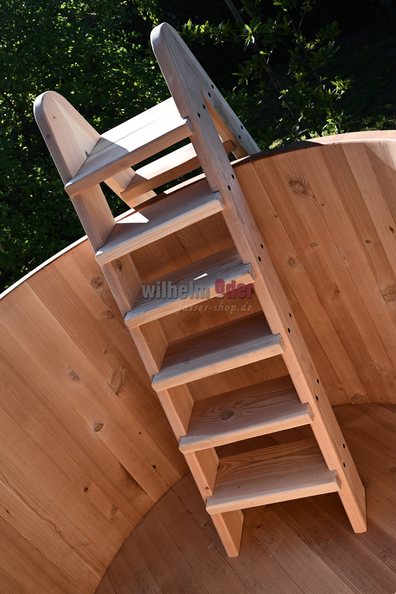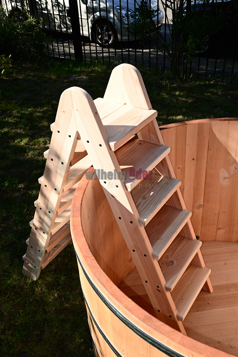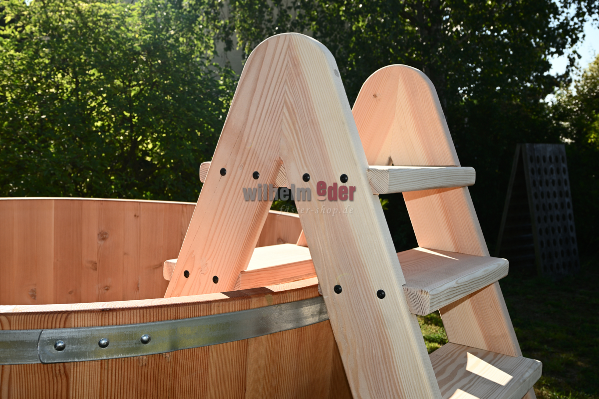 Passend zu Ihrem Badefass fertigen wir in unserer Schreinerei eine Leiter aus luftgetrocknetem Douglasienholz zum erleichterten Ein- und Austeigen.