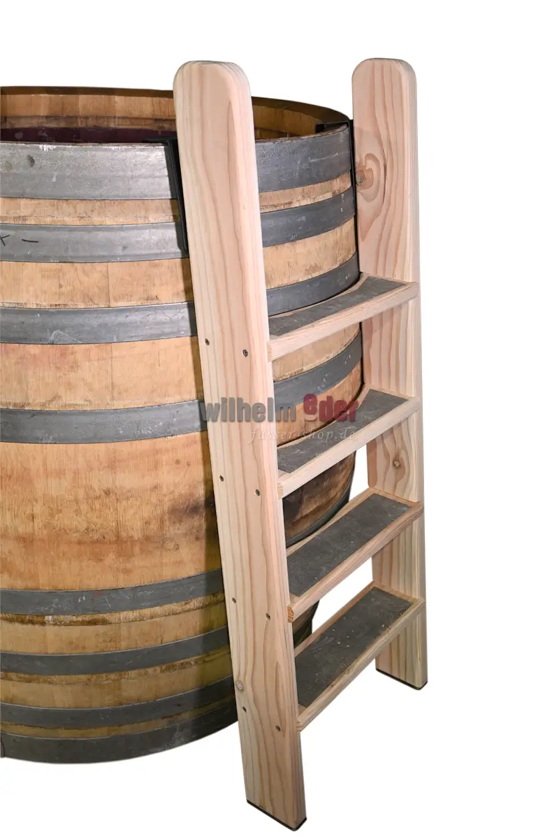 Hinweis: Bitte beachten Sie, dass jede Leiter und jede Bank ein Unikat ist und die Maße je nach Fass angepasst werden können. Durch das Naturprodukt Holz entstehen Abweichungen in Farbe und Maserung.
