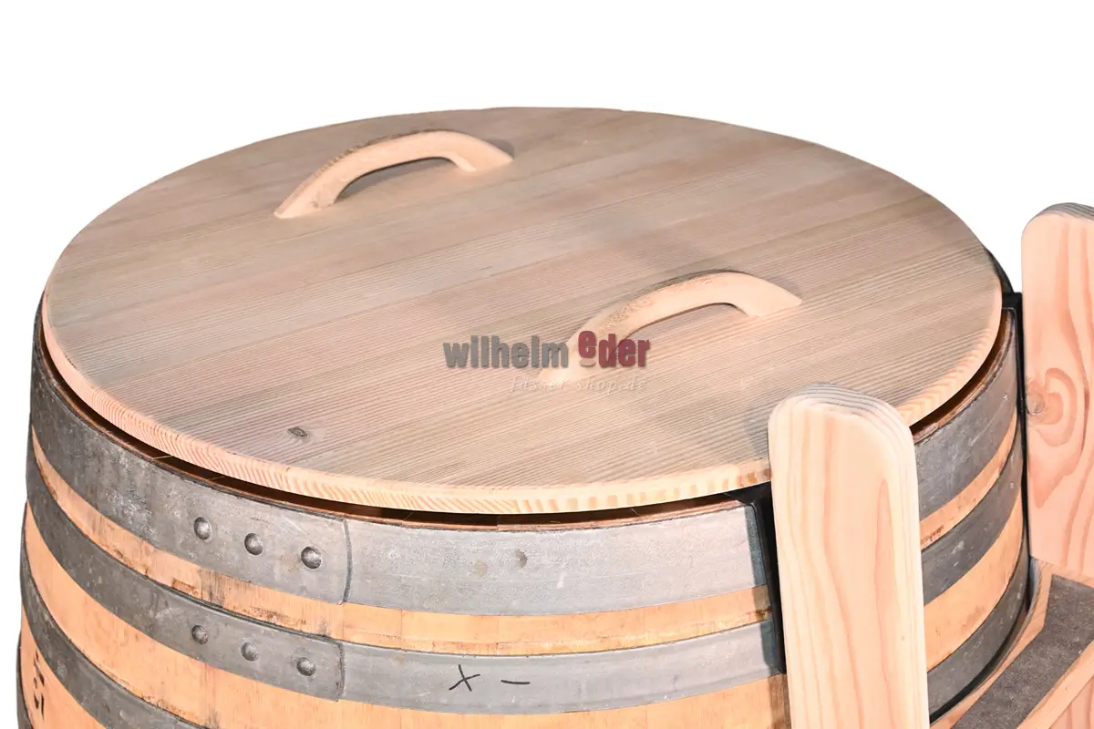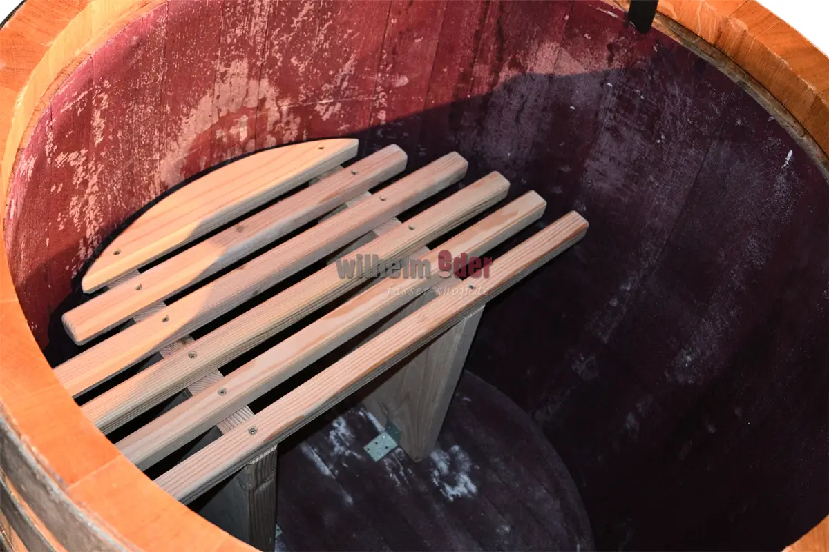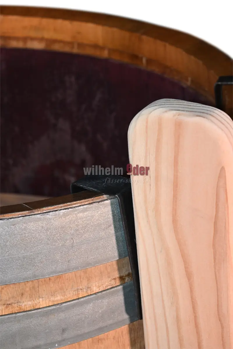 Badefass aus einem gebrauchten 600 l Fass. Die Fässer sind fülldicht und können Färbungen durch den darin gereiften Rotwein aufweisen. Das Fass wird in unserer Schreinerei aufgearbeitet, geschliffen und die Reifen lackiert. Das Badefass ist mit einem Deckel aus Douglasie und zwei Griffen aus Eiche ausgestattet, sodass Sie das Wasser vor Verschmutzungen schützen können.