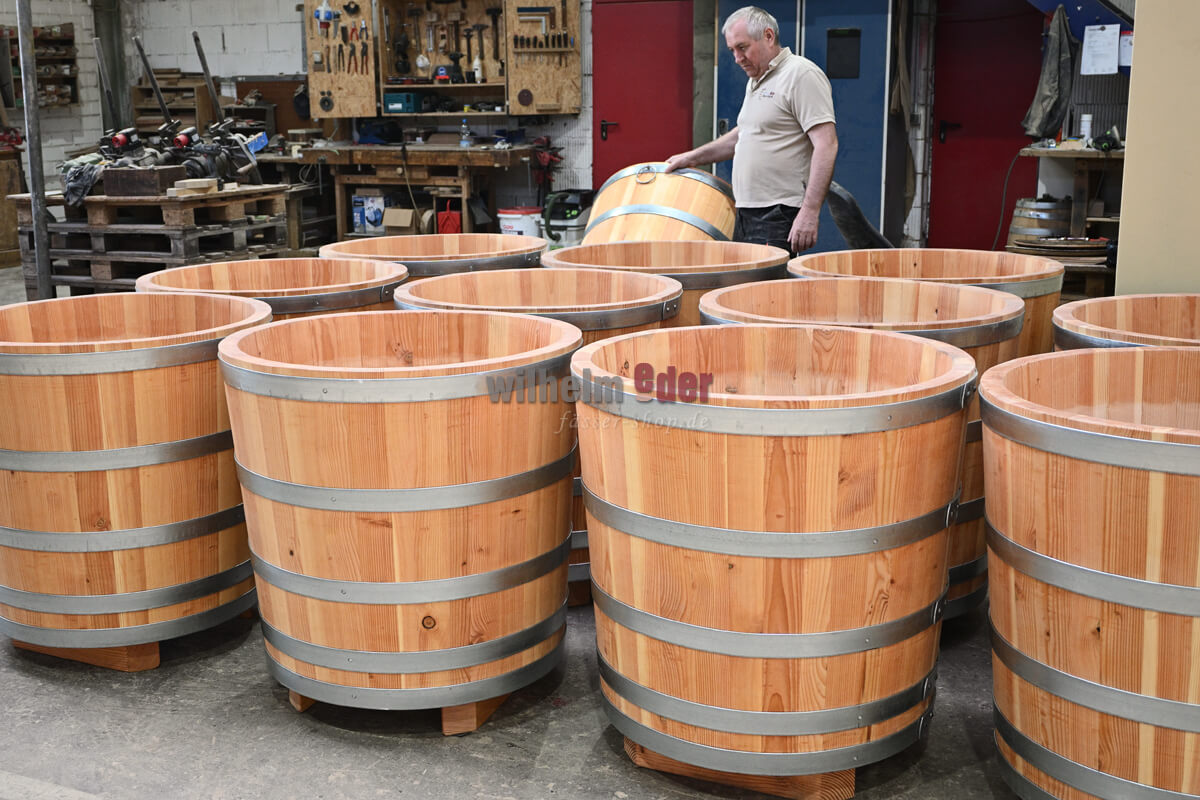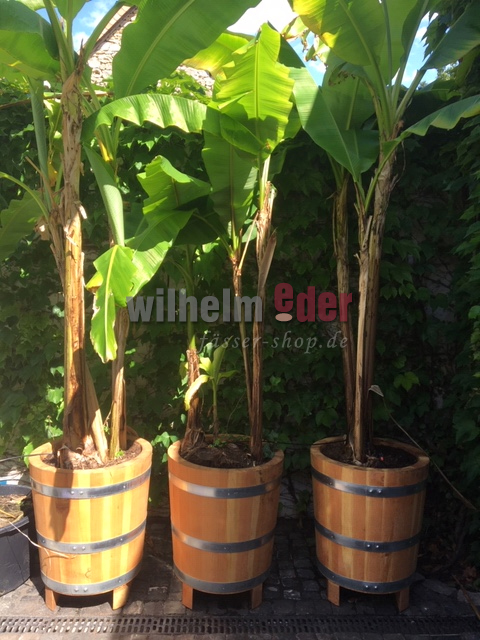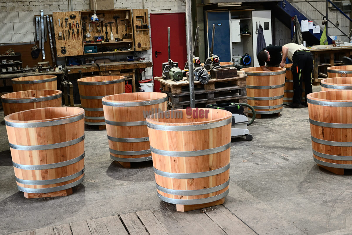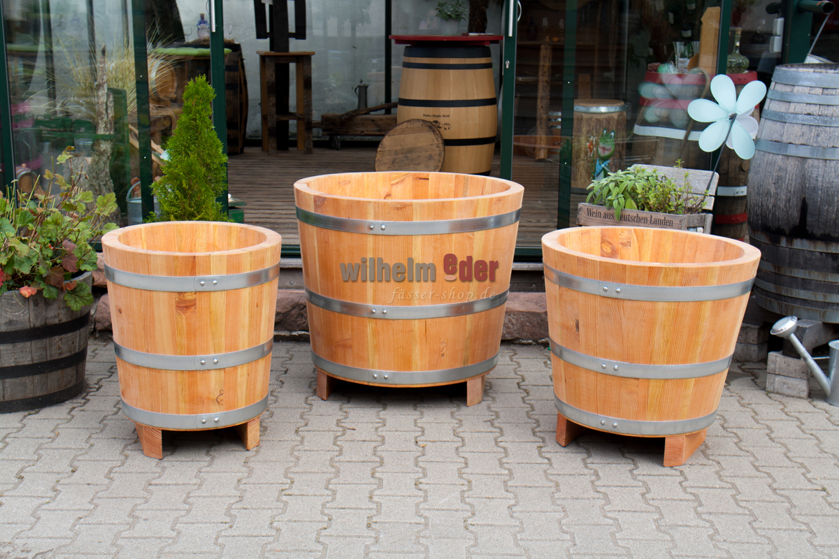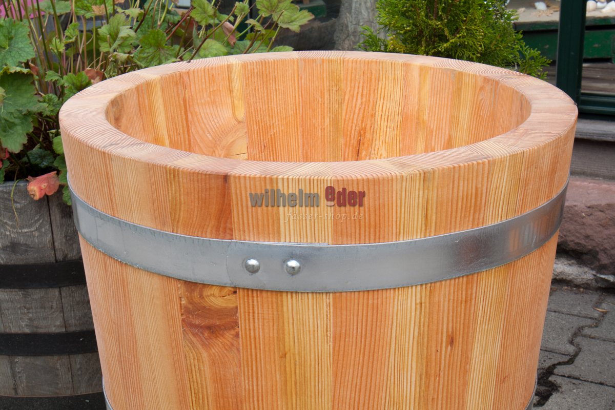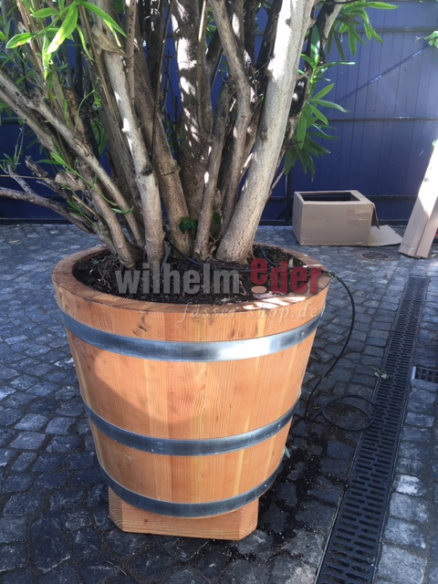 Pflanzgefäße, hergestellt in unserer Küferei aus hochwertigem Douglasienholz, abgebunden mit einer feuerverzinkten, langlebigen Bereifung.