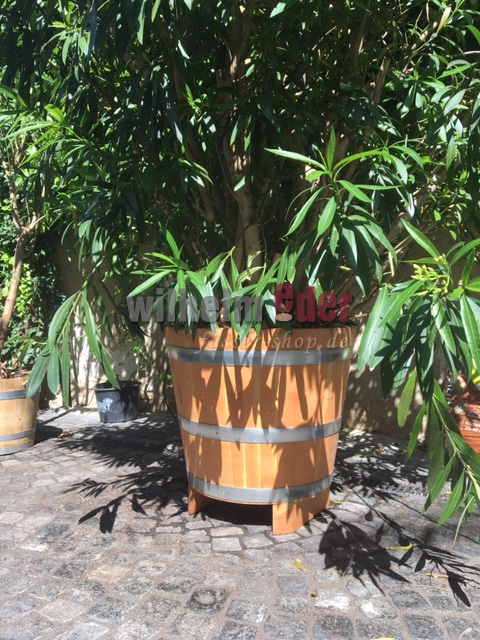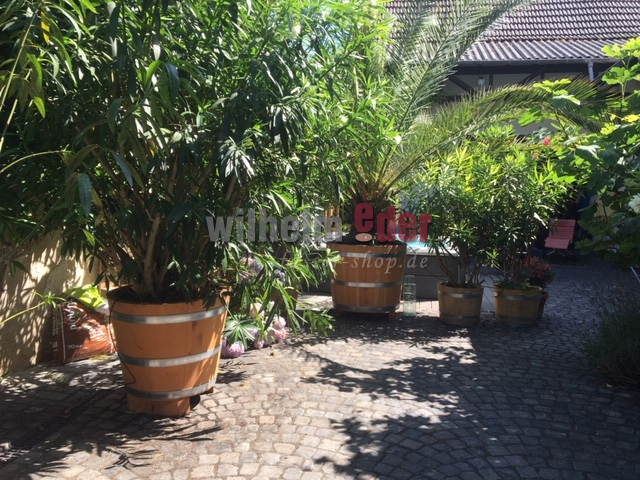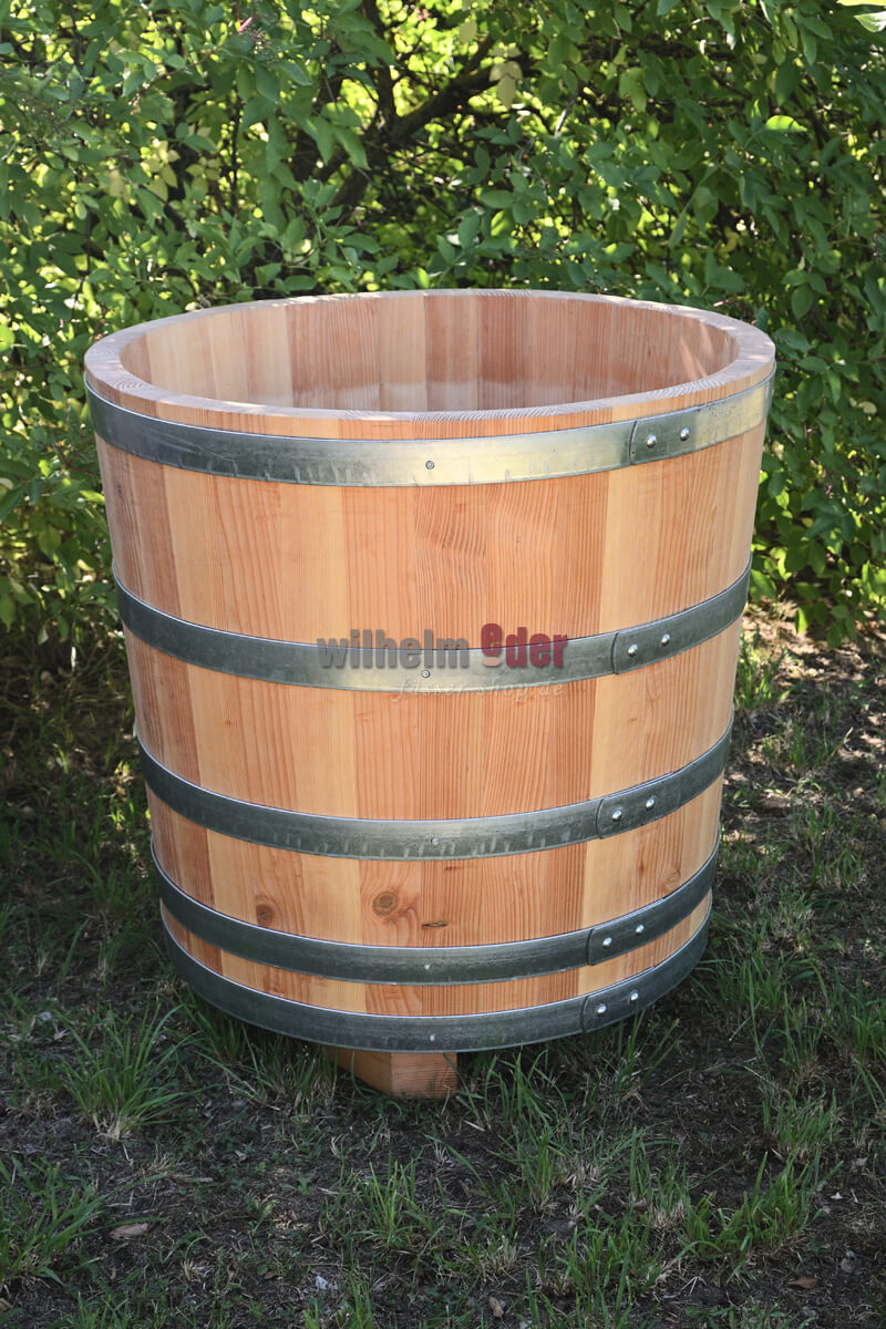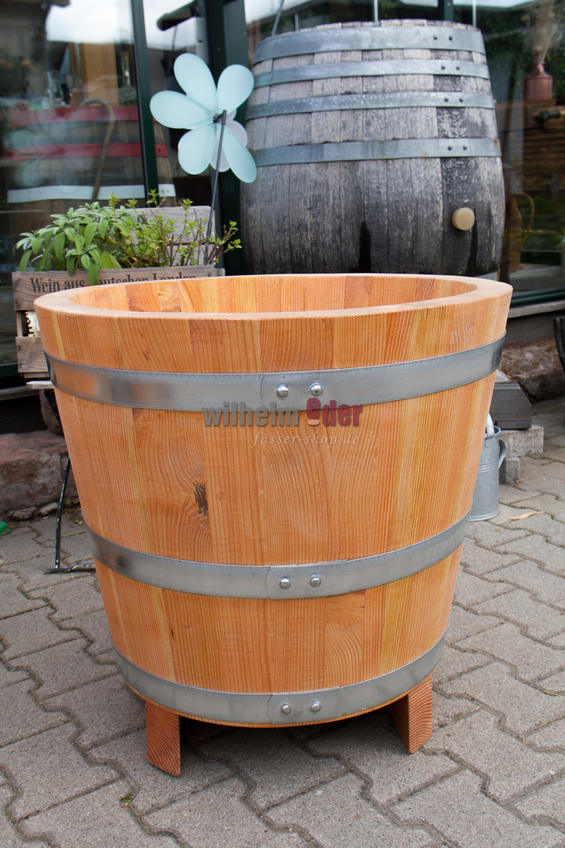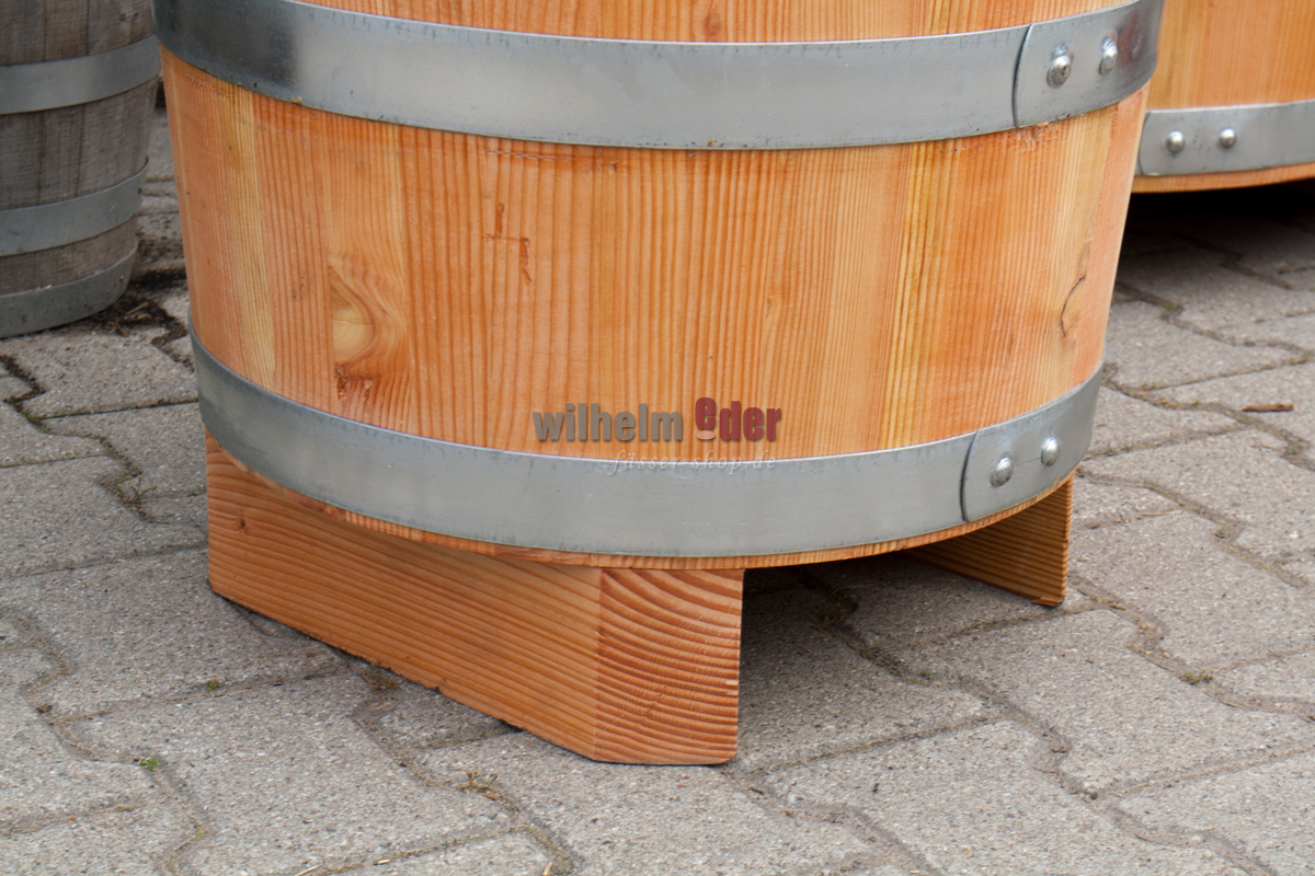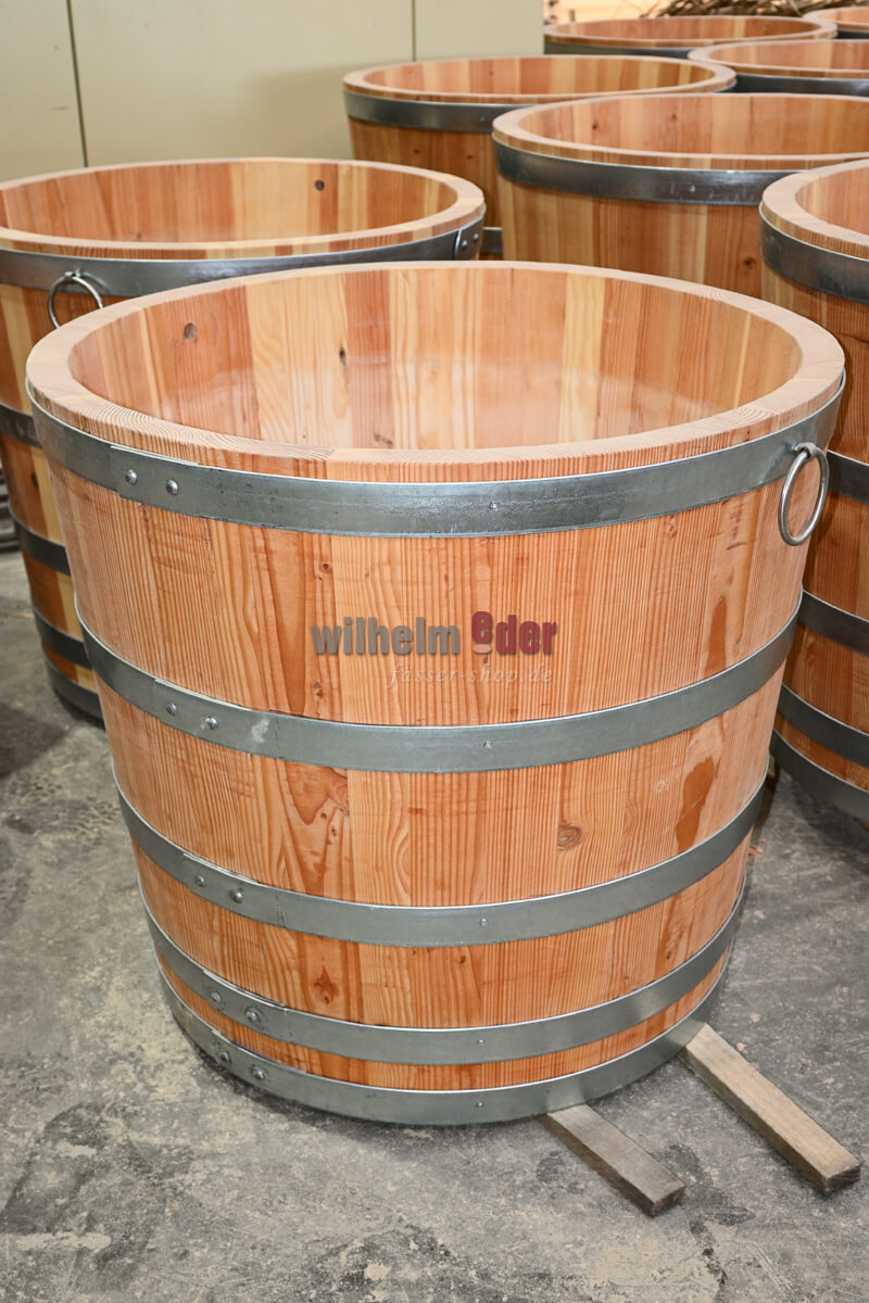 Die Kübel sind außen fein verschliffen und geölt. Am Boden des Kübels sind Kanthölzer (Höhe ca. 9 cm) angebracht, die eine Aufnahme mit einem Stapler bzw. Hubwagen ermöglichen.