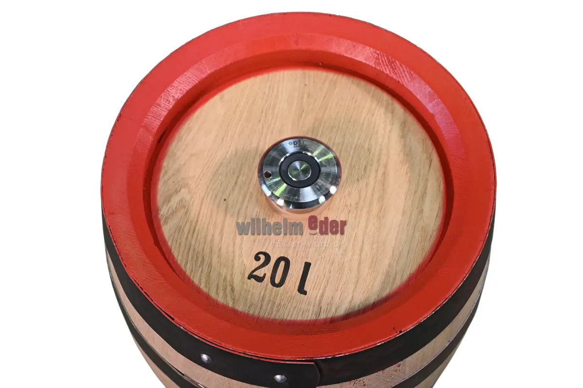 Das 20 l Bierfass wurde aus trockenem Eichenholz hergestellt und der Rand der Köpfe wurde rot gestrichen. Das Fass ist außen Natur belassen und mit innerer Edelstahlblase zur Kegbefüllung.