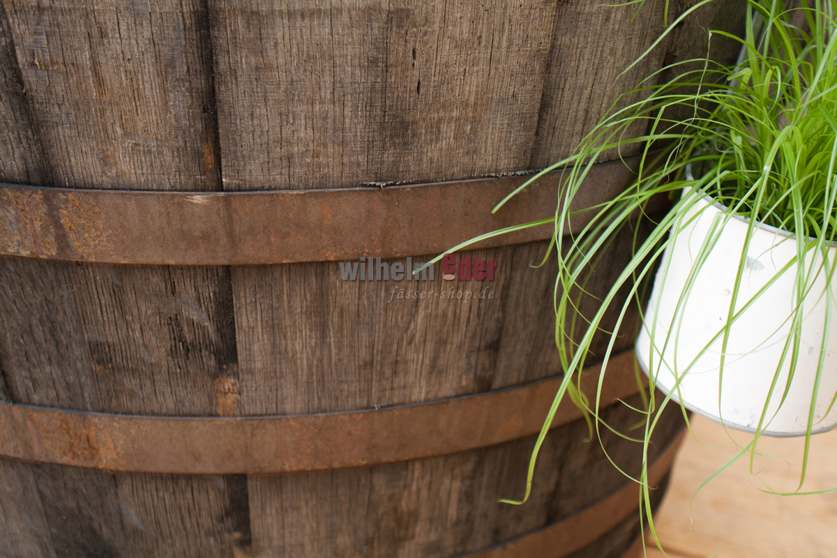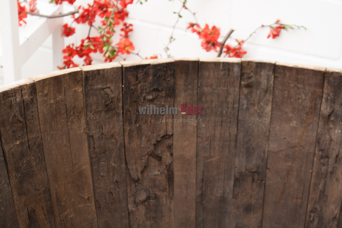 Der Kübel ist aus einem halbierten, ehemaligen 500 l Cognac- oder Weinbrandfass geschnitten.