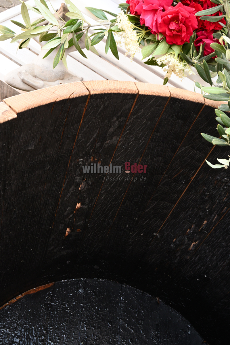 Blumenkübel aus einem 1/2 gebrauchten 190 l Whiskyfass aus Eichenholz mit verzinkten Reifen. Die Fässer weisen Gebrauchsspuren und Bourbonflecken auf.