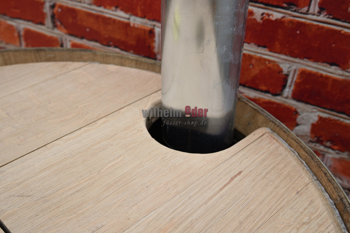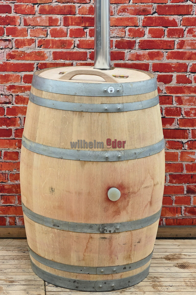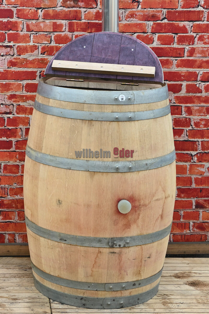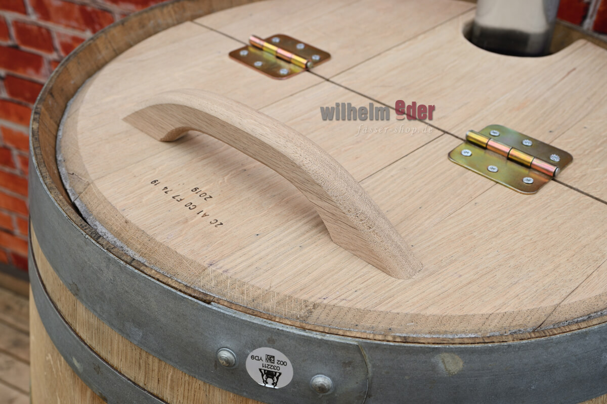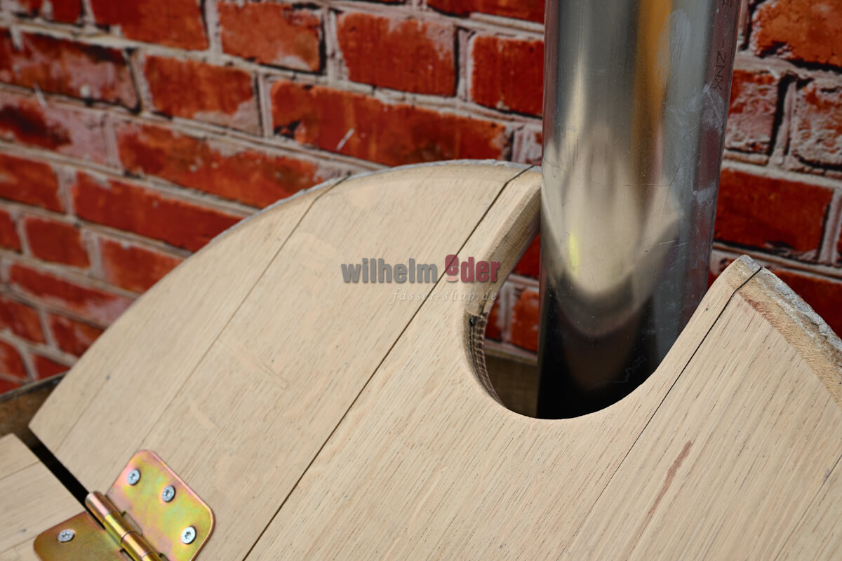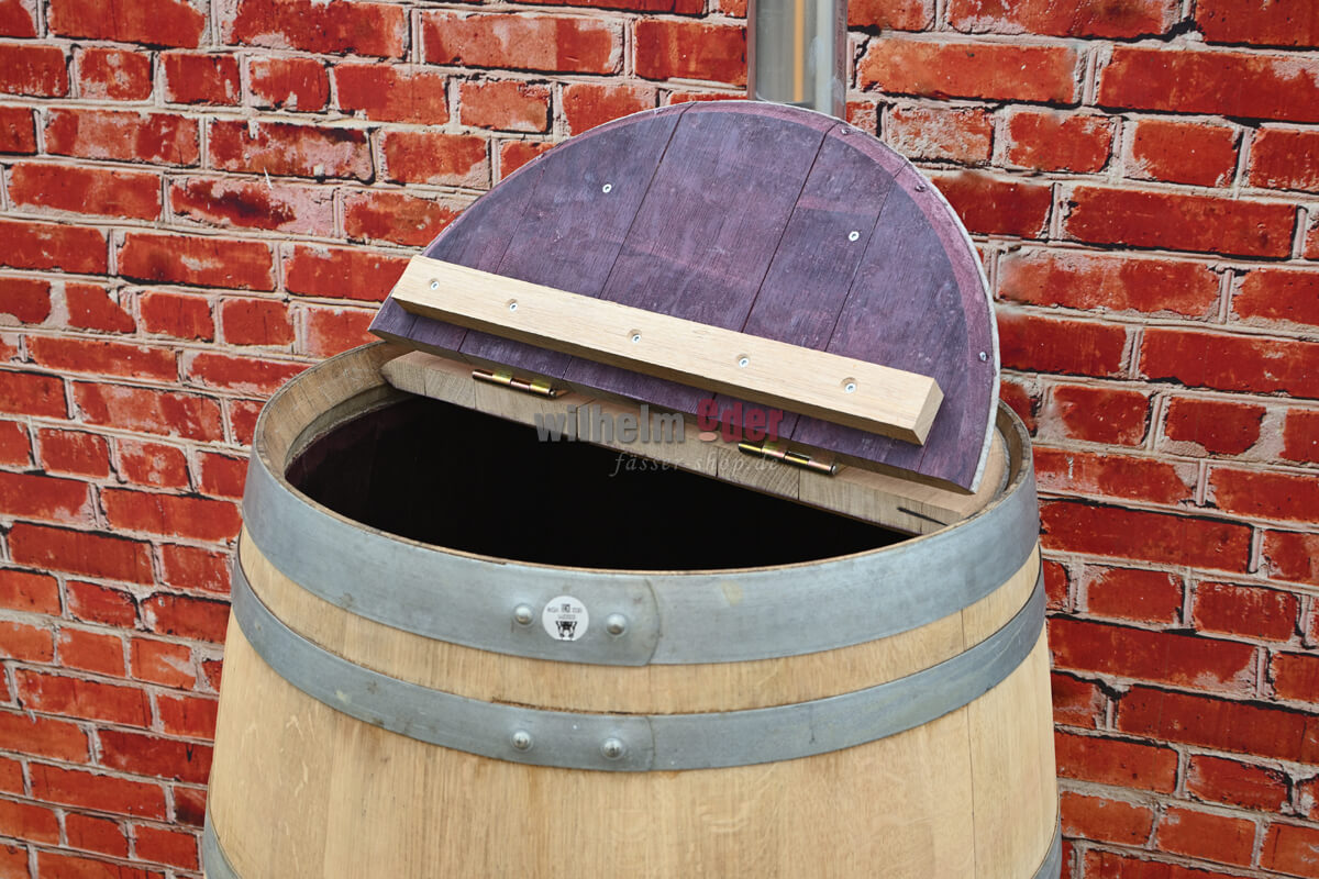 Der abnehmbare, geteilte Deckel kann durch die Montage zweier Scharniere und eines Holzgriffes aufgepappt werden. Der fixe Teil ist mit einer seitlichen Aussparung versehen, durch welche Sie ein Regenfallrohr bis zu einem Durchmesser von 100 mm direkt in die Tonne einführen können.