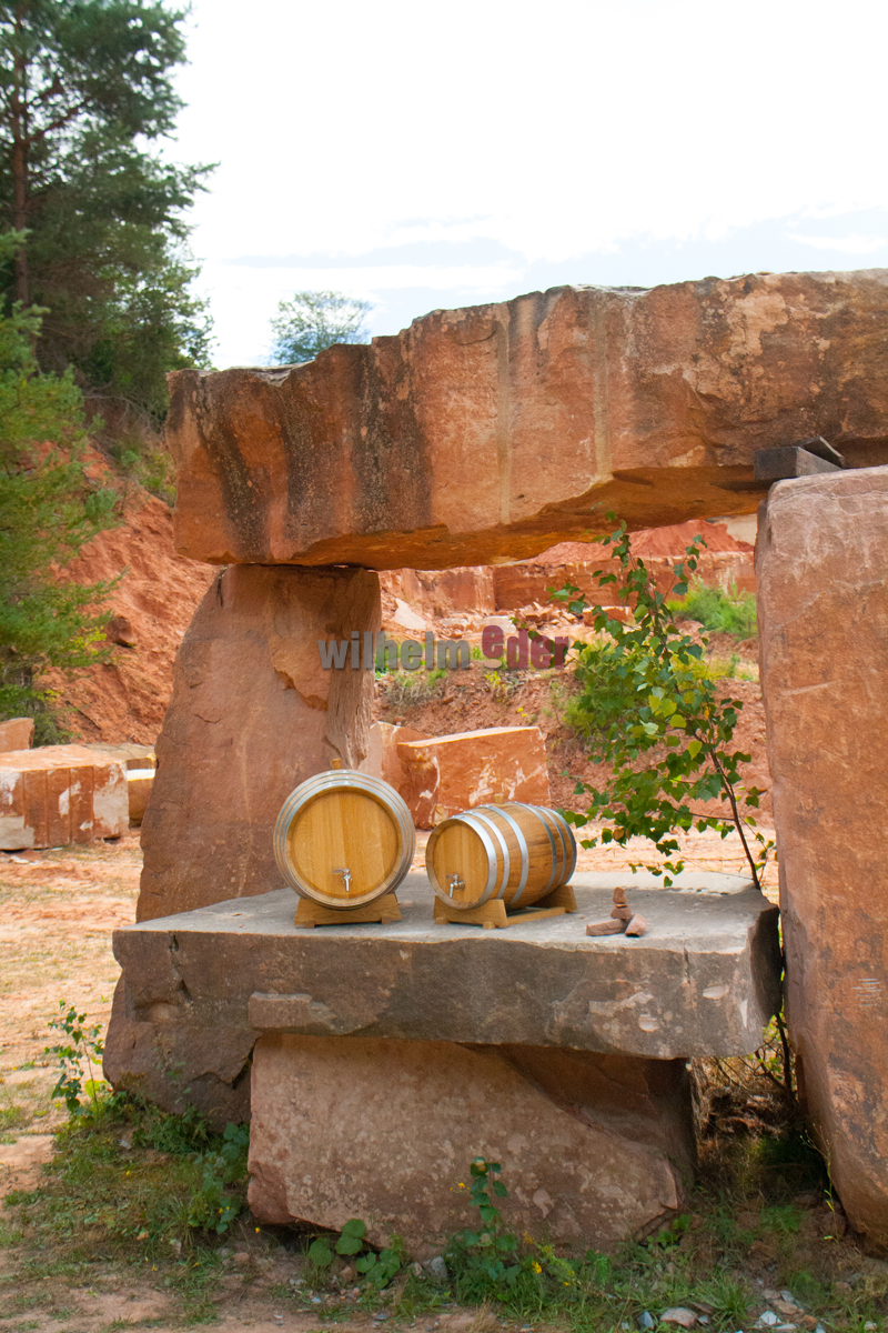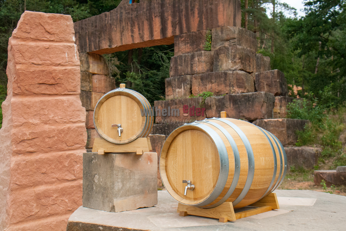 Umbaut wird die 10 l Edelstahlblase mit einem 30 l Eichenfass und die 20 l und 30 l Edelstahlblase mit einem 55 l Fass. Die Dauben werden verleimt und außen farblos lackiert. Die innere Edelstahlblase ist im Fass fixiert und der Zwischenraum (Blase-Fass) ausgeschäumt. Das Spundloch ist zugleich die Öffnung, durch die die Blase befüllt wird. Inklusive Ablaufhahn aus Edelstahl V4A poliert und Fassbock.
