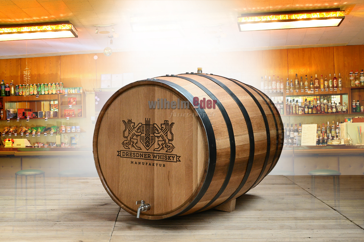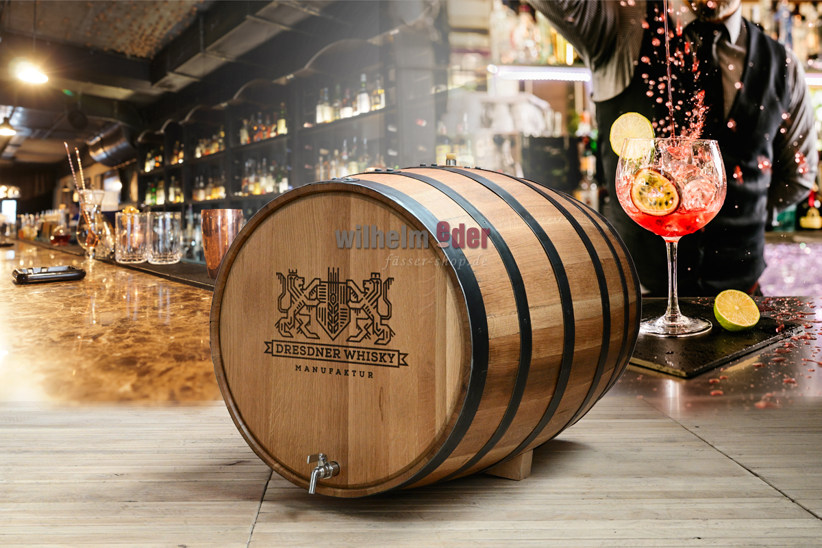 Das Eichenfass wird mit einem kundenindividuellen Laserbranding versehen, das Eichenholz farblos und die Fassreifen schwarz lackiert.