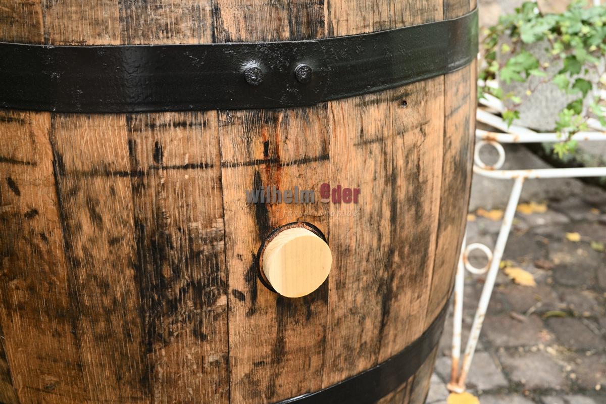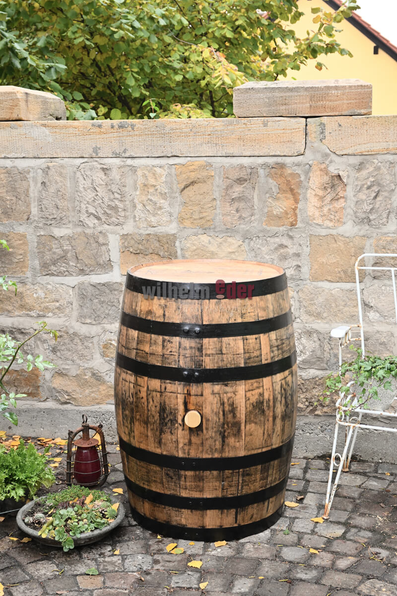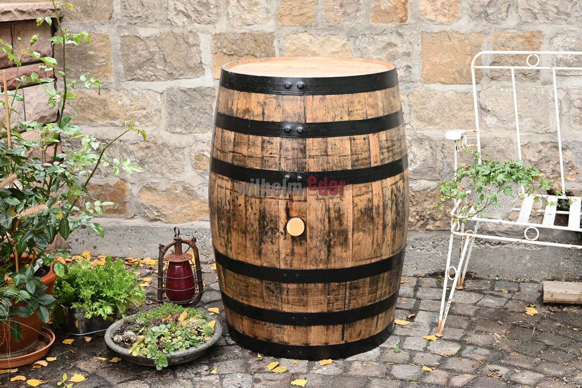 In unserer Küferei wurden bei diesem schönen Dekofass die Metallreifen schwarz gestrichen. Das komplette Fass ist mit Bootslack überzogen. Ausgestattet ist das Fass mit einem Holz- oder Silikonspund.
