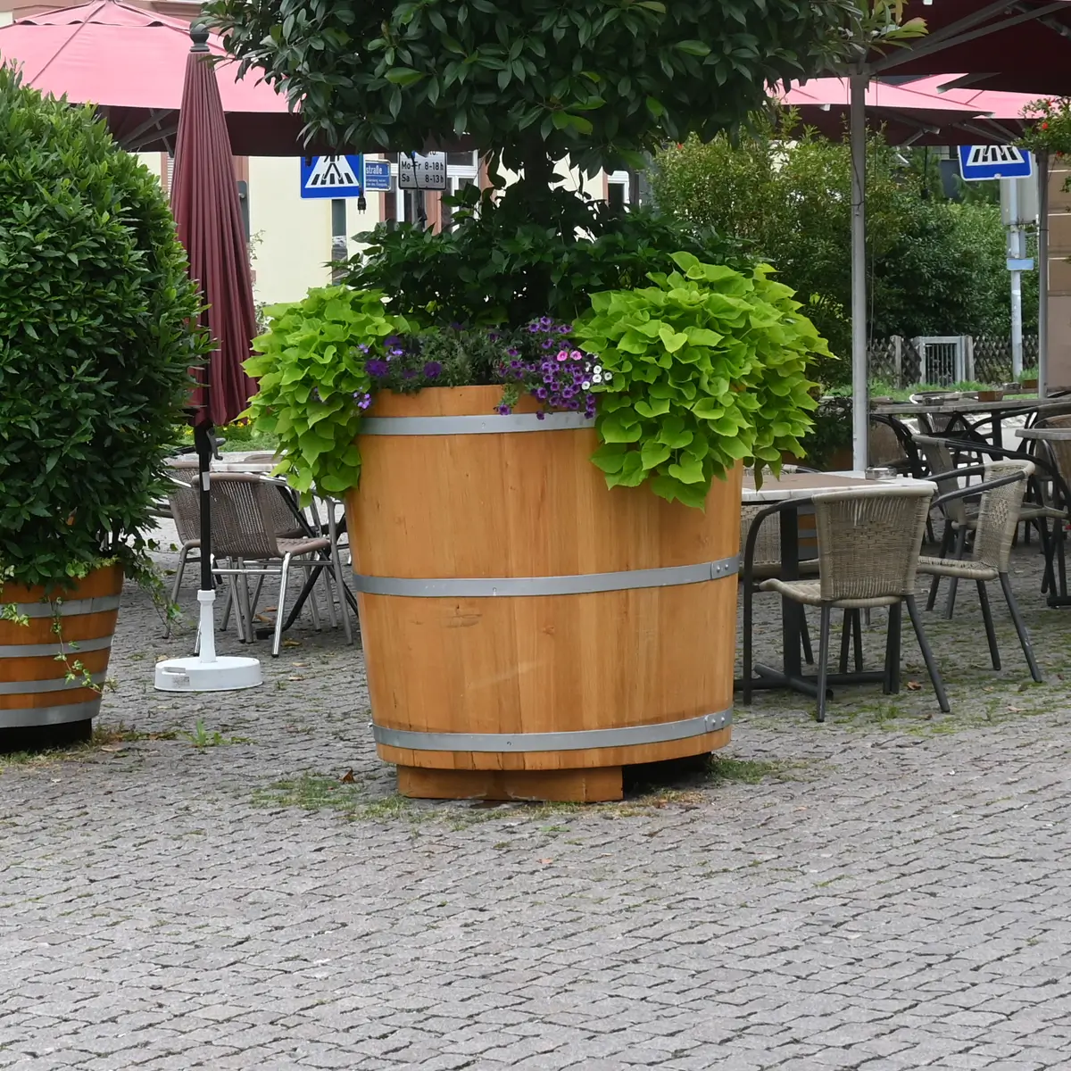 In unserer Küferei fertigen wir professionelle Baumkübel aus heimischer Eiche, Douglasie und gerne auch aus Dauben von Rotweinfässern. Die Pflanzgefäße werden bei uns mit einer feuerverzinkten Bereifung abgebunden, was sie besonders stabil macht. Diese robusten Kübel sind ideal für die professionelle und langfristige Bepflanzung geeignet, sei es in großen Gärten, Parks oder Innenstadtanlagen. Neben runden Baumkübeln stellen wir auch rechteckige Pflanzkästen her. Für eine einfache Handhabung können Metallgriffe und Unterkonstruktionen angebracht werden.