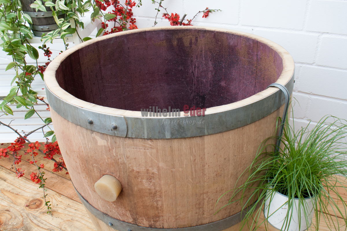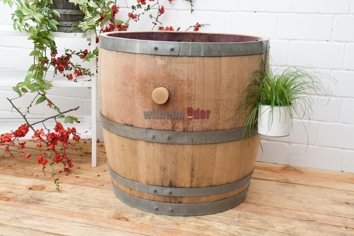 Der Pflanzkübel ist ideal für größere Pflanzen oder Stauden. Die Bottiche sind aus ehemaligen Eichefässern aus Rotweinbelegung geschnitten und von guter Substanz. Die Kübel sind fülldicht und somit auch als Miniteiche geeignet. Die Bereifung ist feuerverzinkt, der Kopfreifen am Fassboden kann auch aus Weidenholzreifen bestehen.