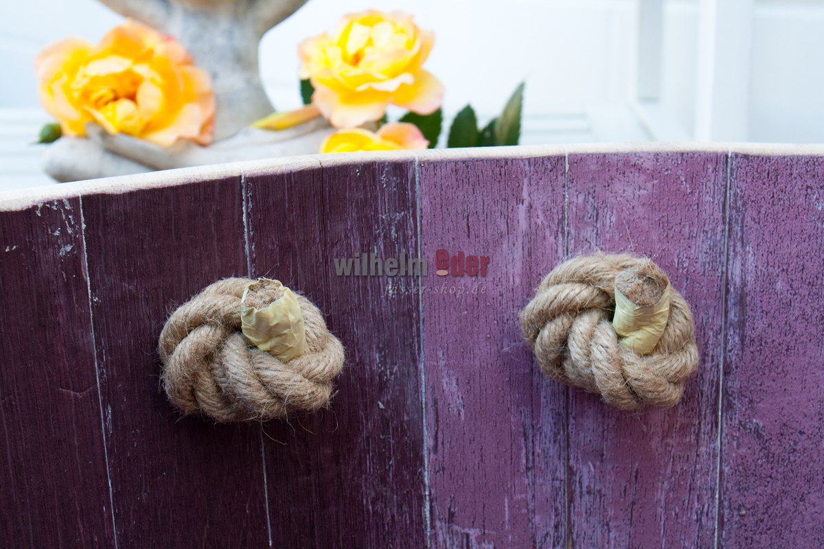 Dekorative Tauschlaufen als Haltegriffe für Blumenkübel. Wir bohren je zwei Löcher in die Kübel und verknoten die Taue im Fassinneren.