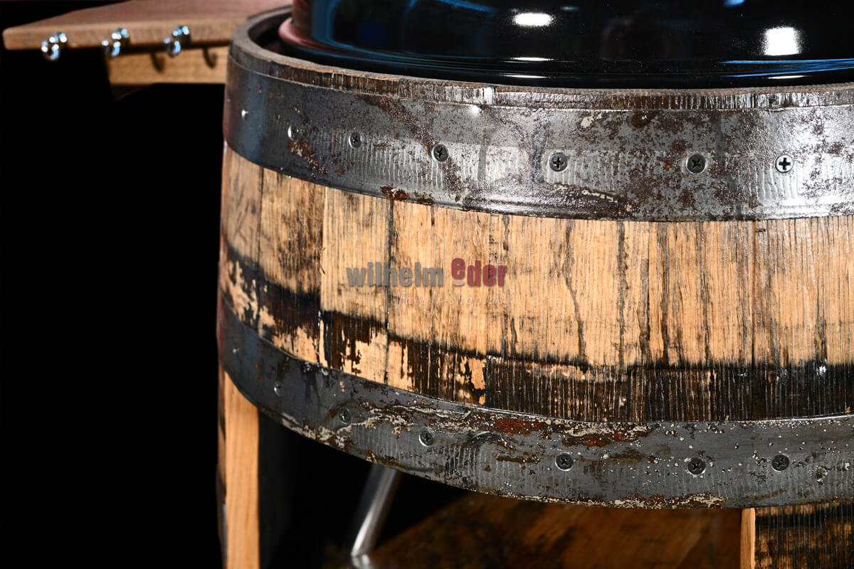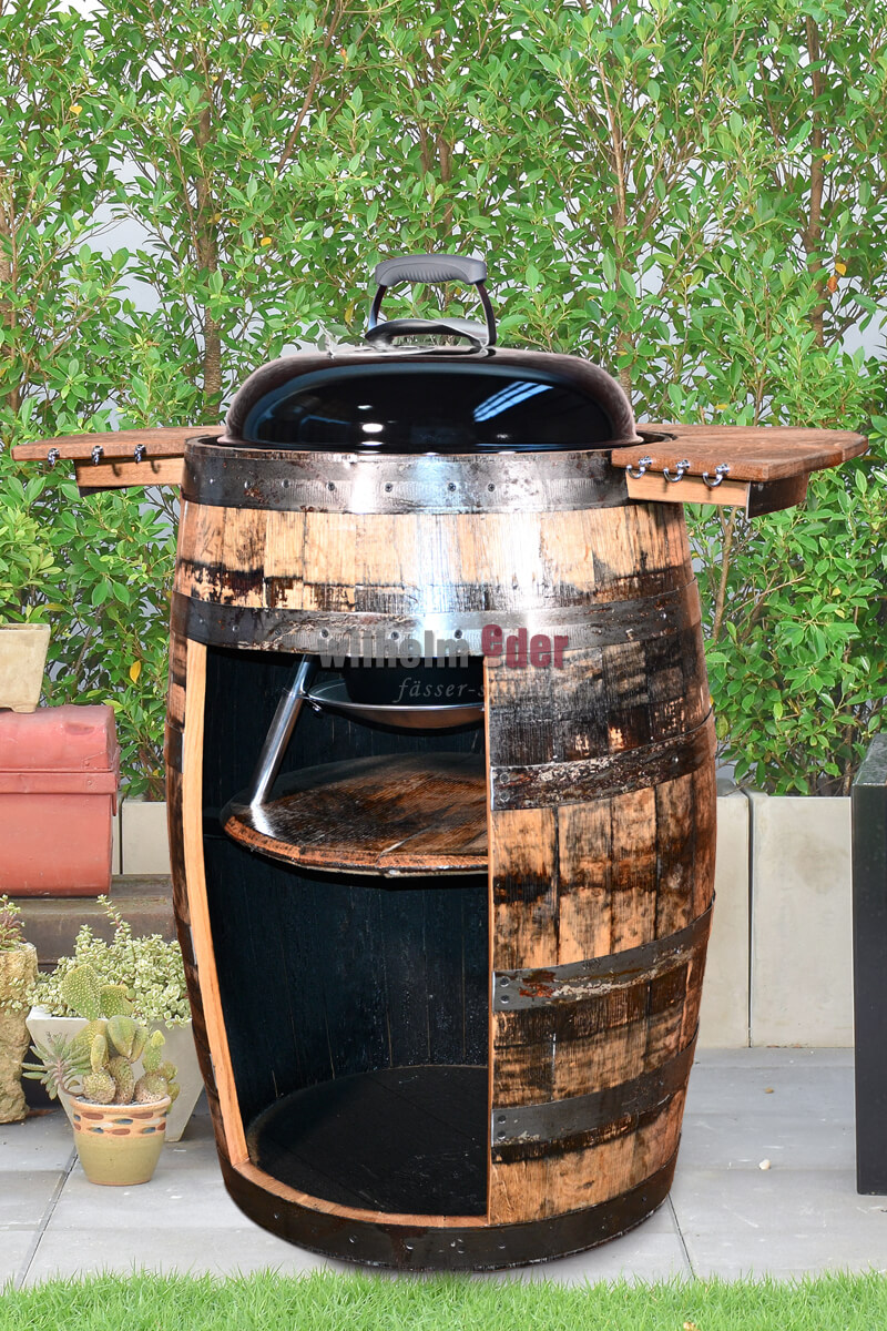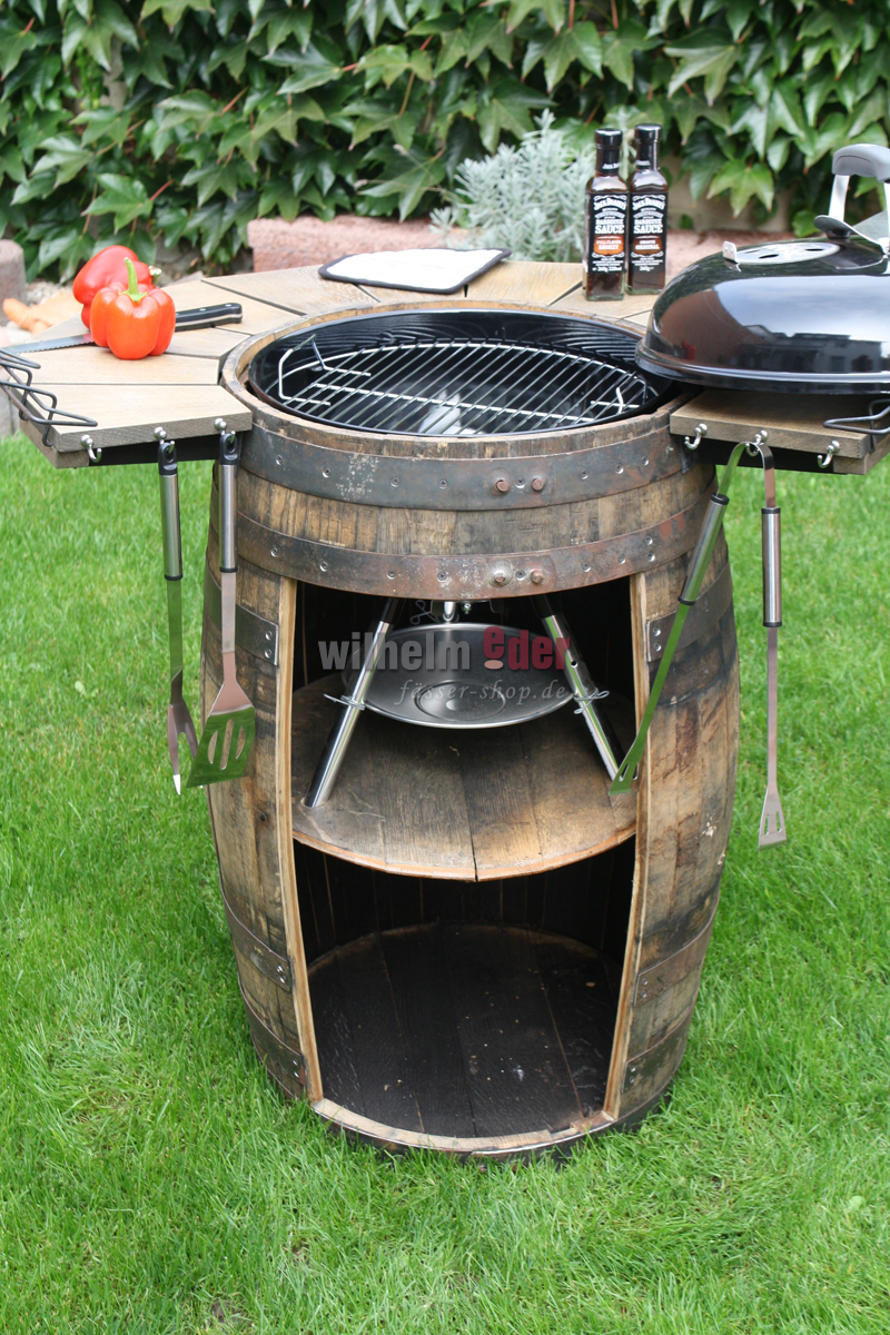 Das Fass ist vorne geöffnet und mit einem originalen Whisky-Deckel innen als Regal ausgestattet. Die Reifen werden professionell verschraubt und gegen das Herabfallen gesichert. Das Fass ist im Originalfarbton mit Bootslack überzogen oder dunkel gebeizt. Ausgestattet ist das Fass mit einem hochwertigen Holzkohlegrill (Weber Original Kettle Ø 47 cm). Um den Kopf des Fasses ist zu ca. 2/3 ein Ablagekranz aus Fassholz gefertigt. Seitlich finden sich sechs Haken zum Aufhängen von Grillzubehör.
