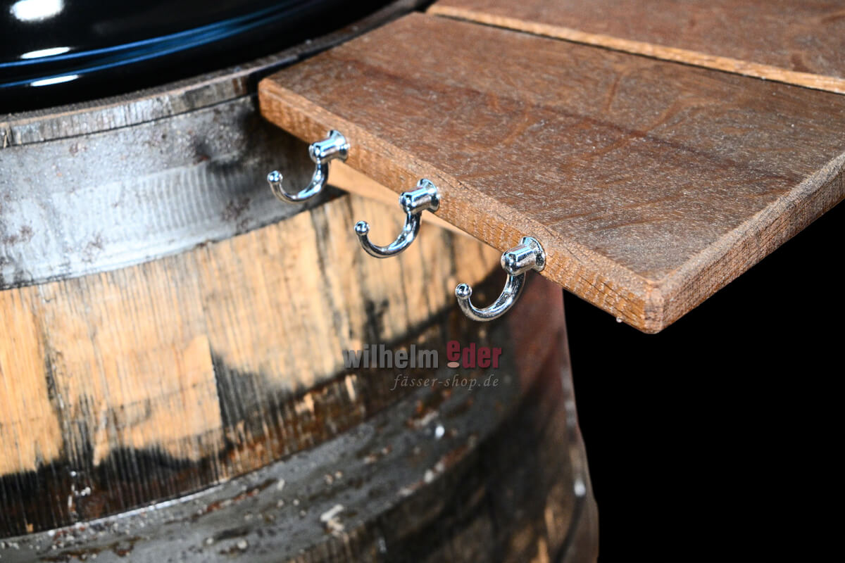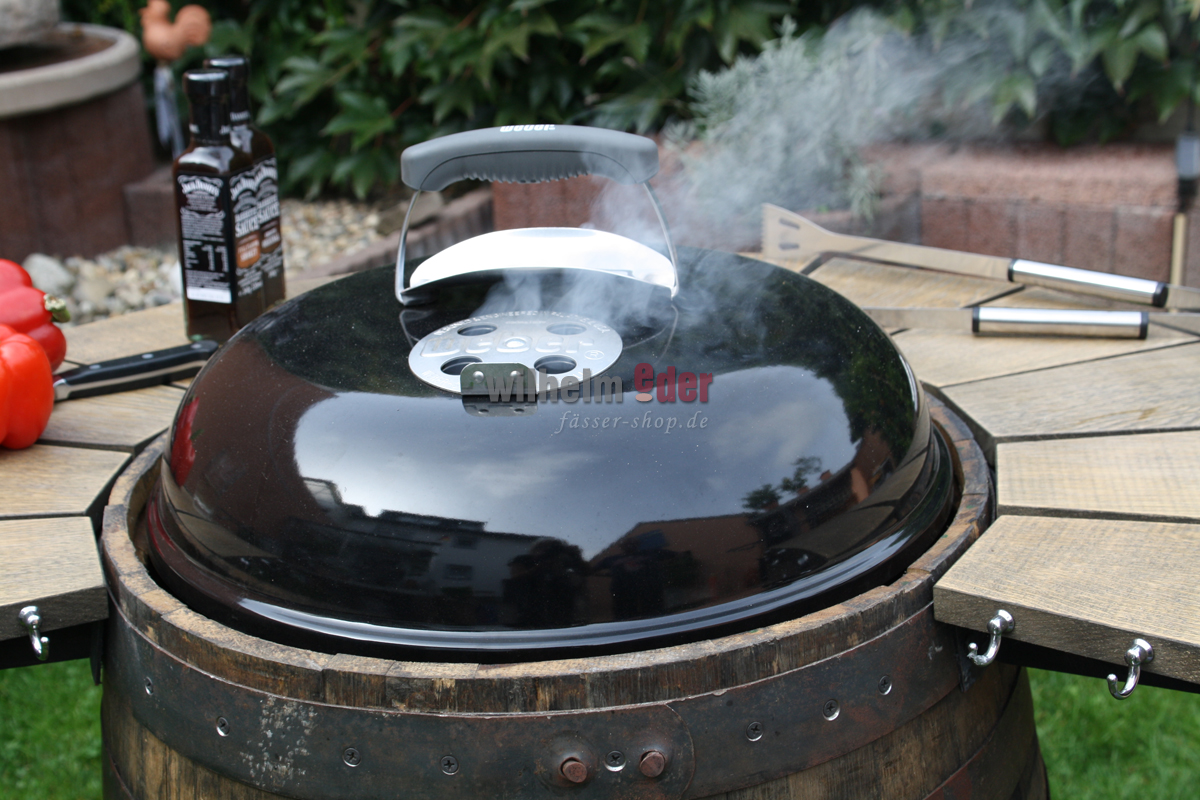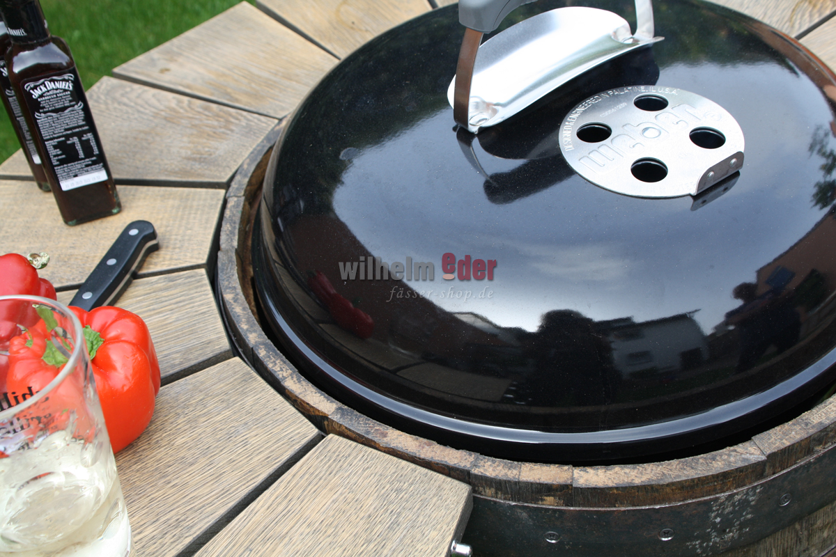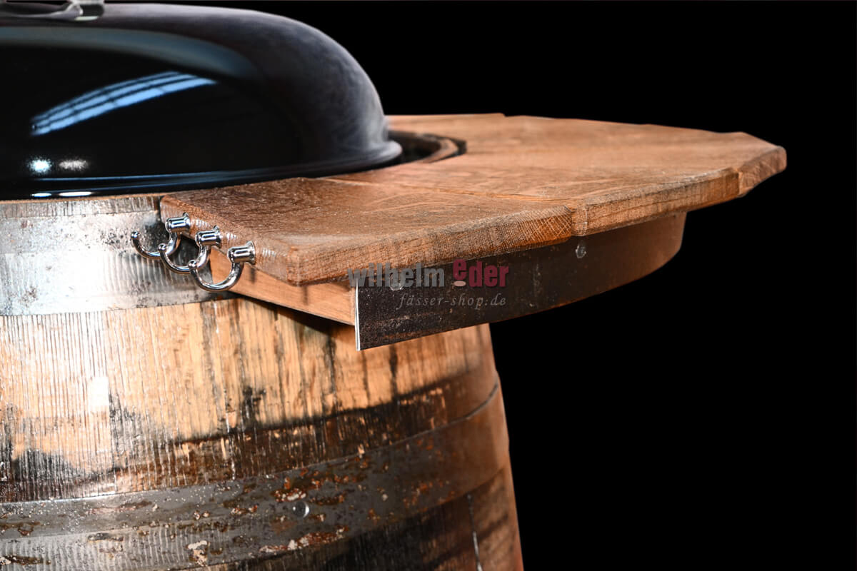 Das Fass ist vorne geöffnet und mit einem originalen Whisky-Deckel innen als Regal ausgestattet. Die Reifen werden professionell verschraubt und gegen das Herabfallen gesichert. Das Fass ist im Originalfarbton mit Bootslack überzogen oder dunkel gebeizt. Ausgestattet ist das Fass mit einem hochwertigen Holzkohlegrill (Weber Original Kettle Ø 47 cm). Um den Kopf des Fasses ist zu ca. 2/3 ein Ablagekranz aus Fassholz gefertigt. Seitlich finden sich sechs Haken zum Aufhängen von Grillzubehör.
