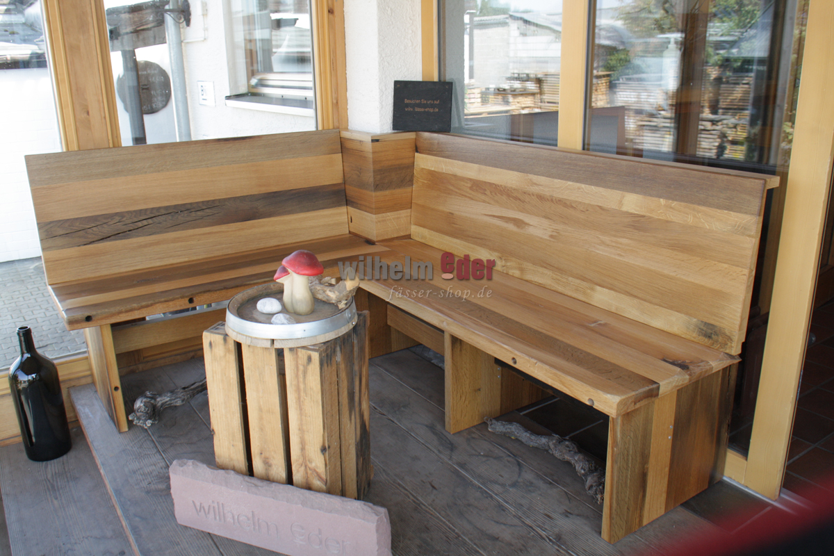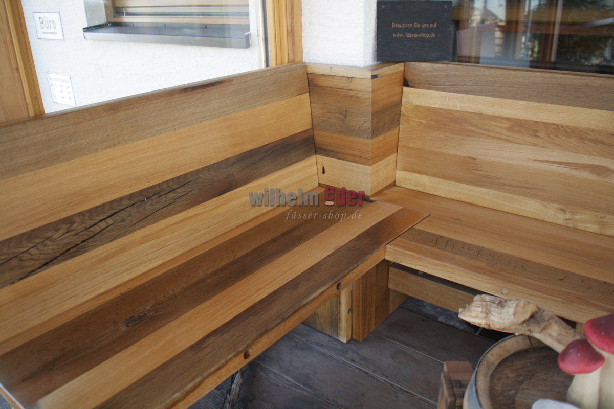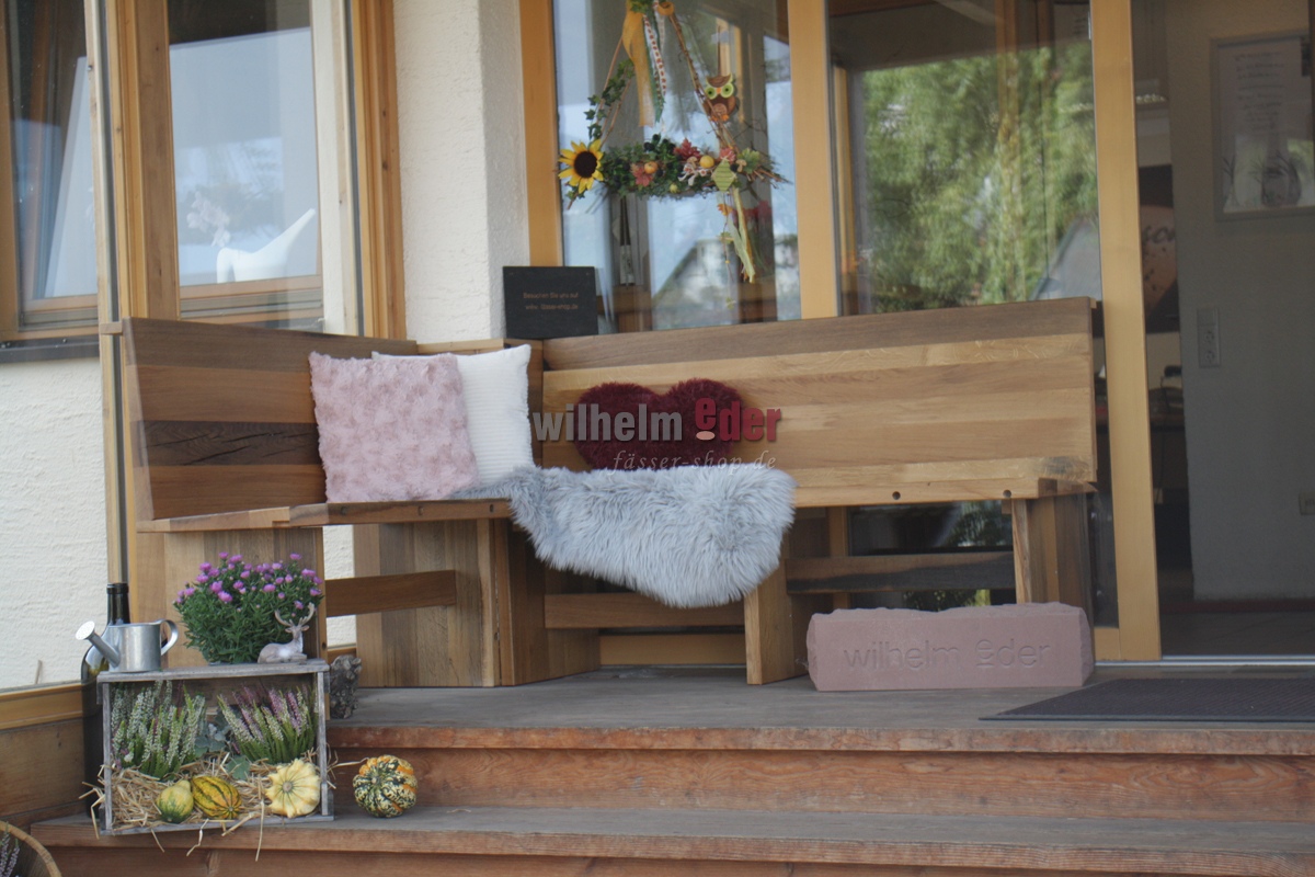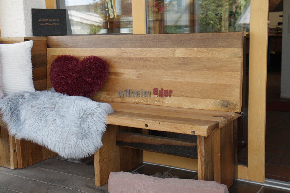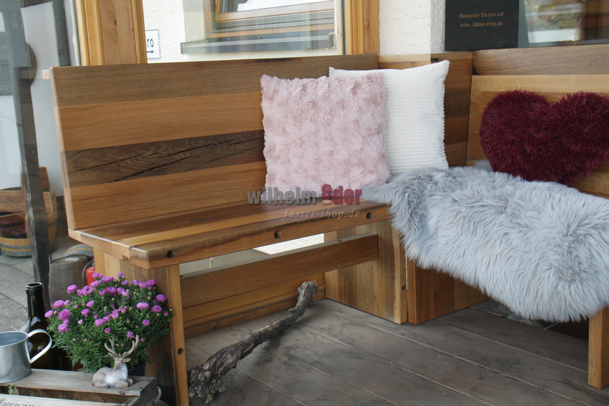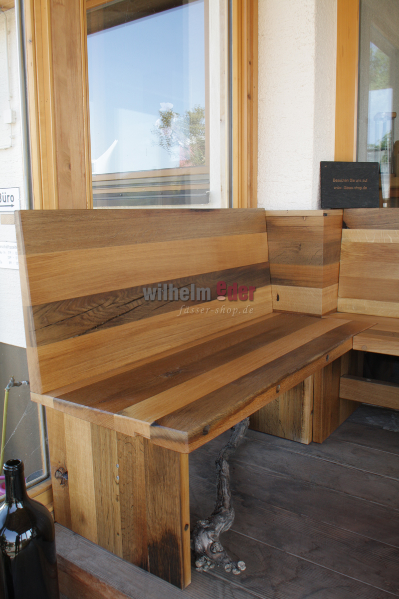 Die Sitzbank ist ausschließlich aus dem Vorderboden eines alten 10.000 l Großfasses aus Eiche gebaut, welches wir im Weinkeller unseres Kunden ausgekellert haben und das jahrelang mit kostbarem Rotwein belegt war. Die Dauben wurden gehobelt, abgerichtet, entsprechend auf Maß gebracht und verleimt. Die Kanten sind gefast. Der besondere Sitzkomfort entsteht durch die nach hinten leicht abfallende Sitzfläche und die schräg gestellte Lehne. Gepaart mit der dicken Holzstärke entsteht ein elegantes und rustikales Möbelstück zugleich. Nach dem Feinschliff wird die Bank lackiert, hierzu verwenden wir ausschließlich ökologische und nachhaltige Farben.