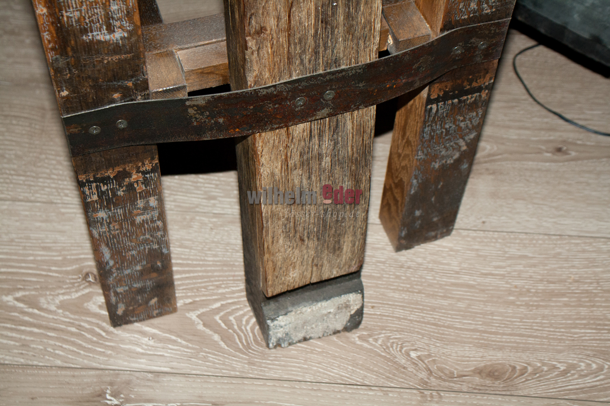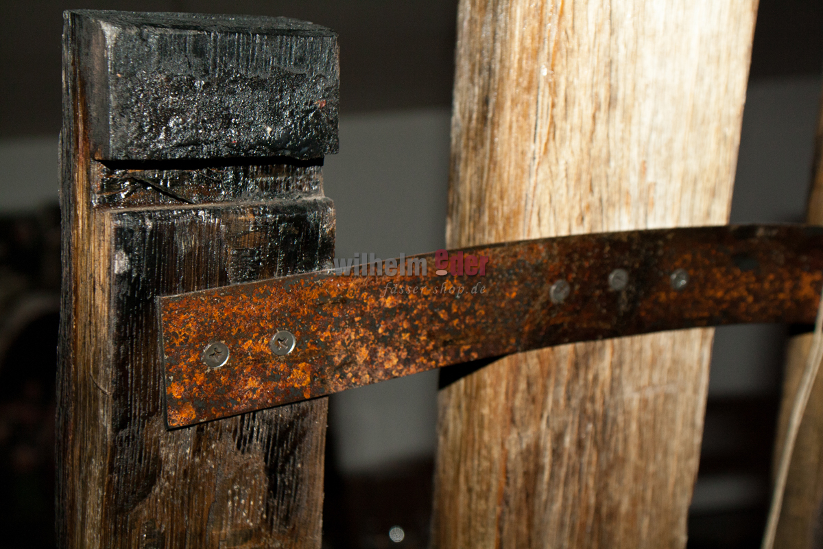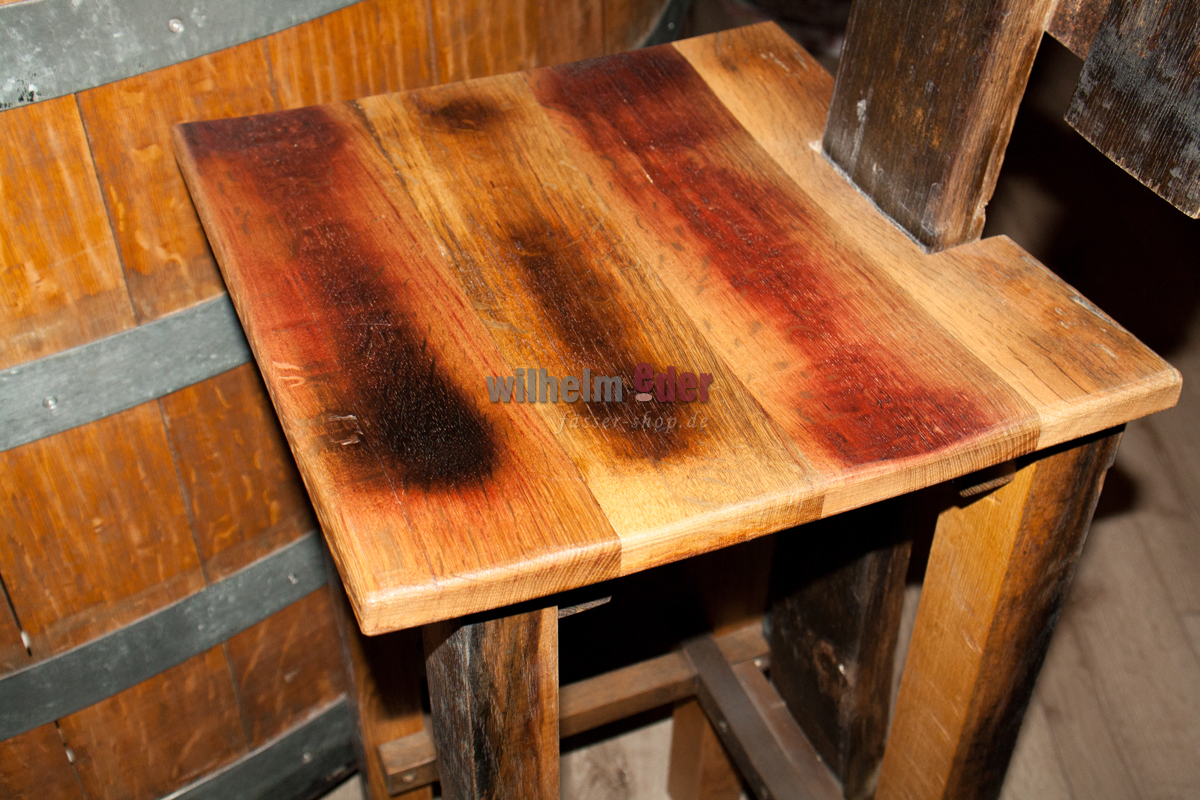 Die großen Dauben wurden leicht angeschliffen und mit Öl überzogen, während die Sitzfläche ausgeschliffen wurde für einen größeren Komfort beim Sitzen. Die Rückenlehne gibt beim Sitzen leicht nach, da sie nur mit den Fassreifen befestigt wurde. Eine Kreuzplattung an den Füßen sorgt für die nötige Stabilität. Am Ende wurde der Barstuhl mit Bootslack überzogen.