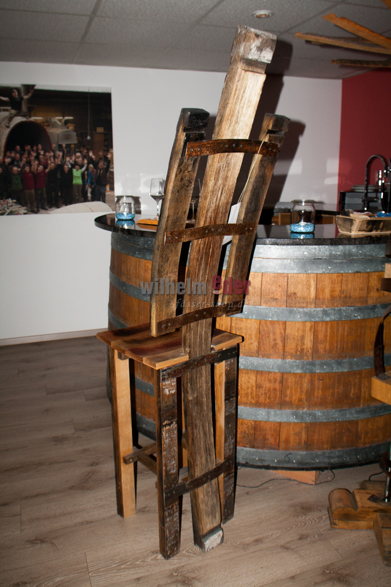 Ein exklusiver Barstuhl aus ehemaligen Fassdauben und Fassreifen hergestellt wurde.