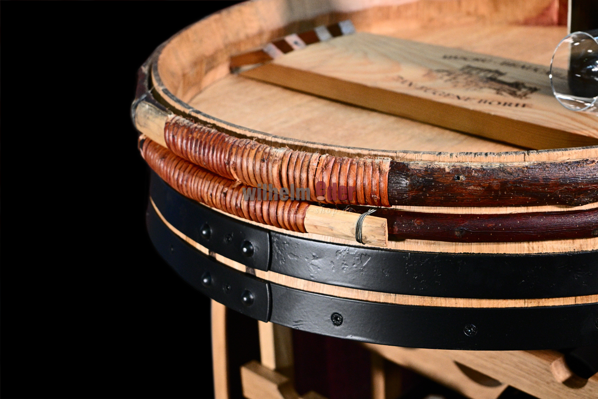 Das Inlay ist ein Weinregal für Ihre wertvollen Flaschen aus massivem Fasseichenholz. Die Metallreifen sind schwarz lackiert. Eine weitere Charakteristik dieser Fässer ist die tiefroten Bäuche, der Tradition entsprechend wurden die Originale mit Rotwein gestrichen und von unseren Tischlern und Küfern sorgfältig erhalten.