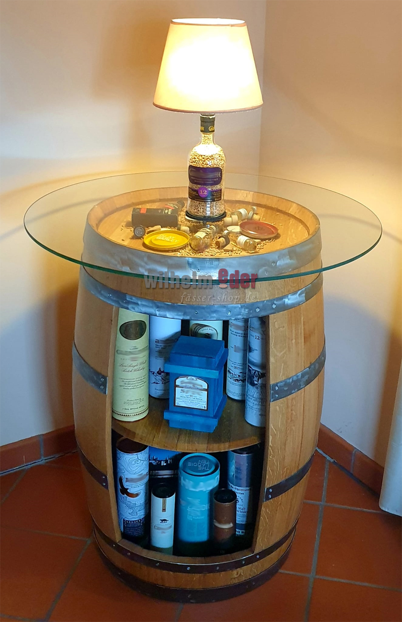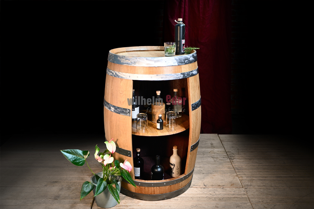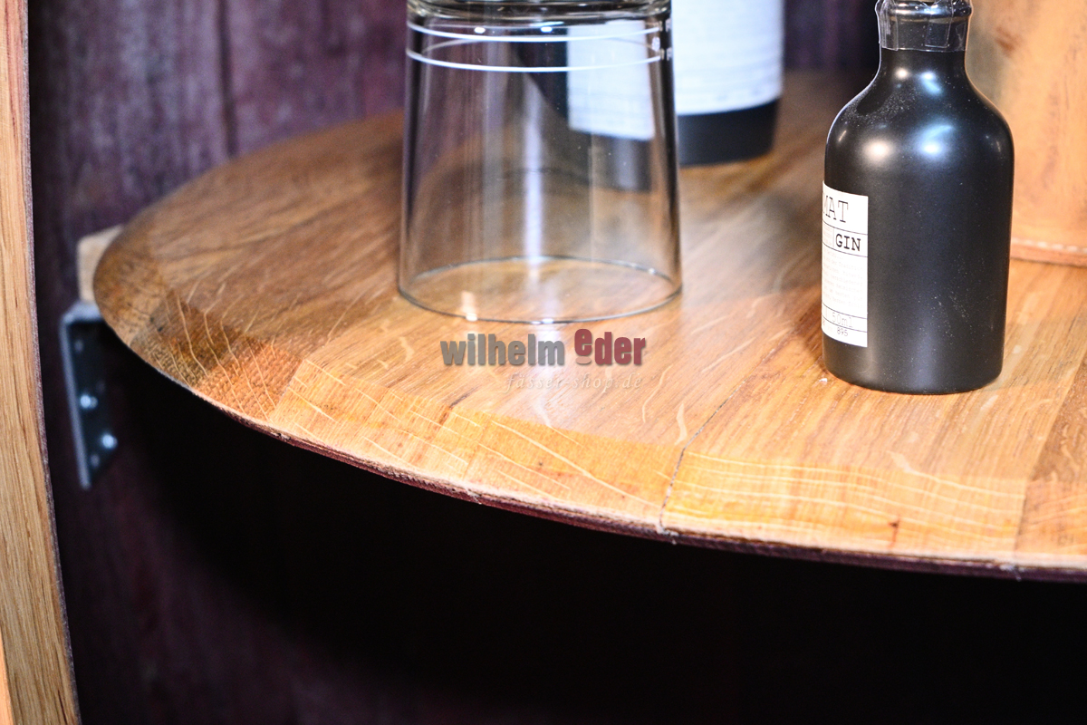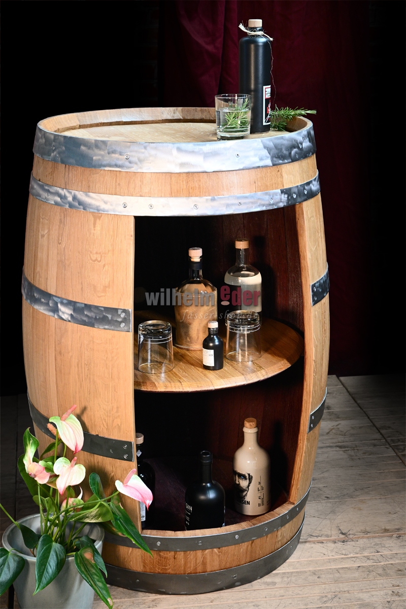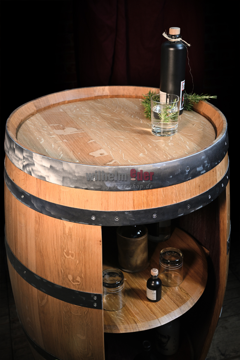 Regalfass aus einem gebrauchten 225 l Barriquefass, durch Meisterhand umgebaut als exklusives Weinlagerregal mit einem integrierten Barriquefassboden als Abstellfach für Gläser und Flaschen.