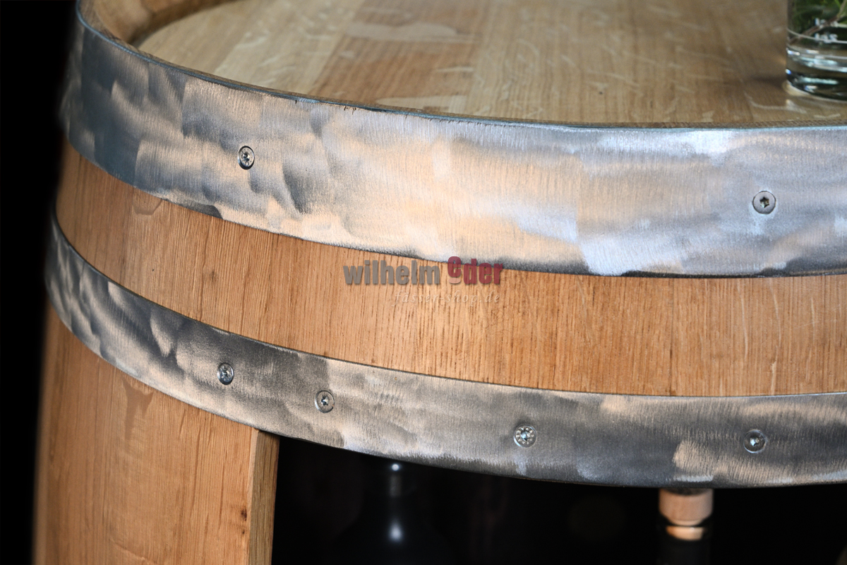Die feuerverzinkten Reifen sind gebürstet, anschließend wird das Fass mit hellem Klarlack überzogen.