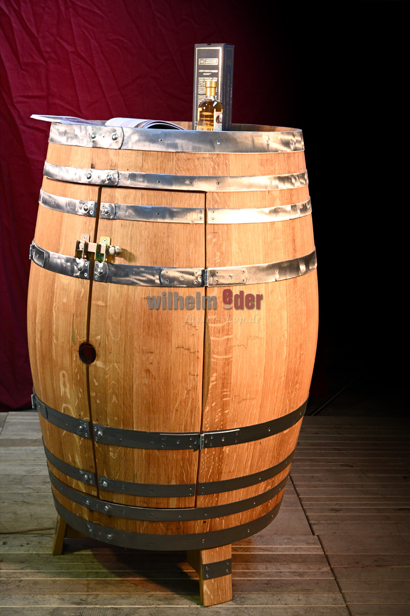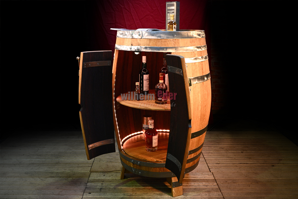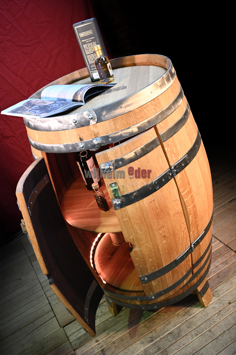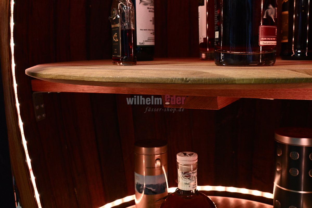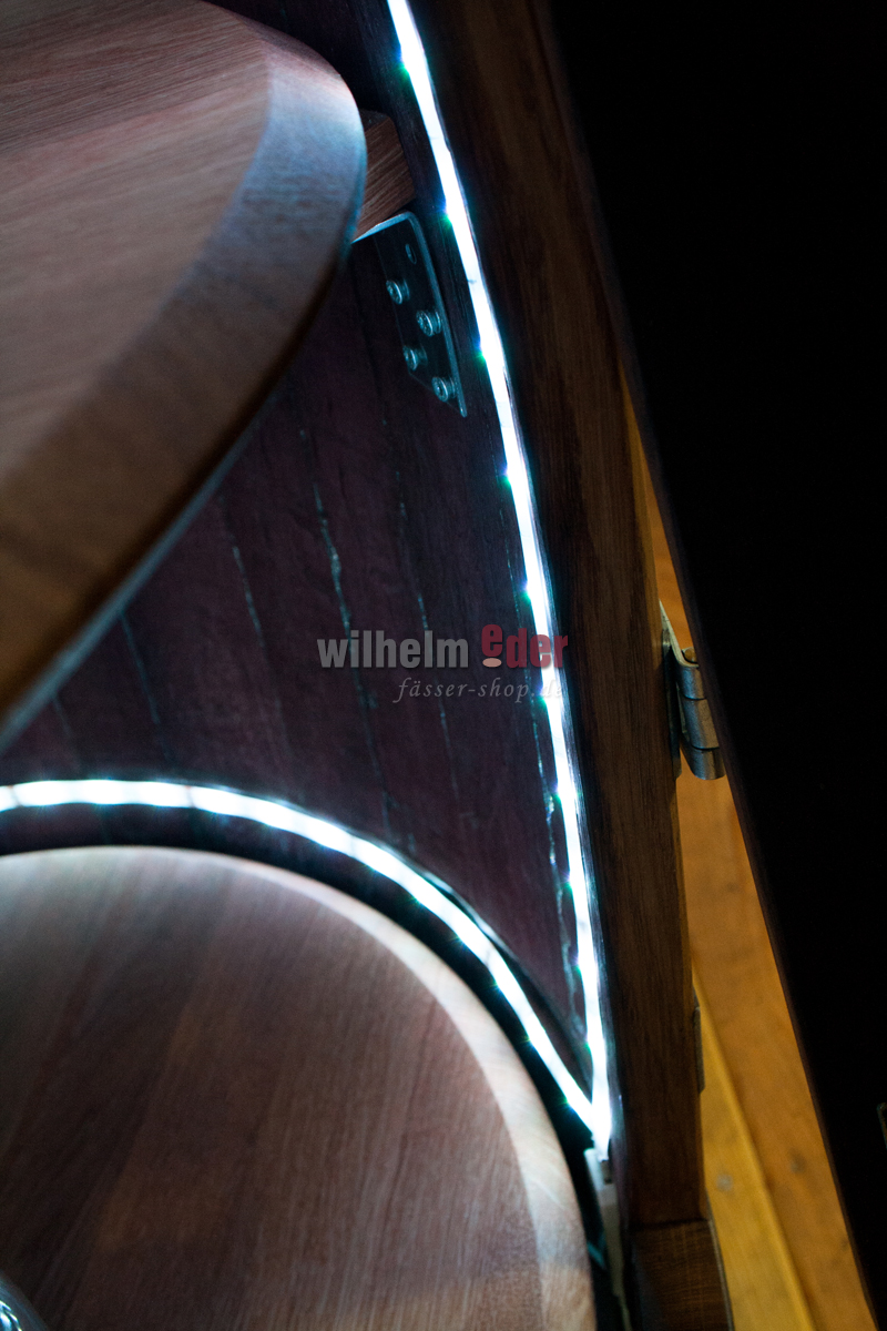 Die zweiflüglige Tür öffnet nach außen. Innen ist das Fass unbehandelt und zeigt eine Rotweinfärbung. Zwei drehbare Regalböden sind das Highlight in dem Fass. Für die richtige Beleuchtung sorgt das eingebaute LED-Band.