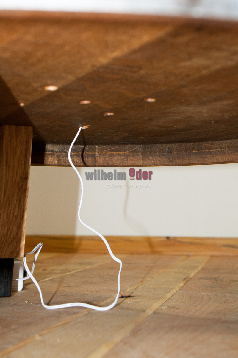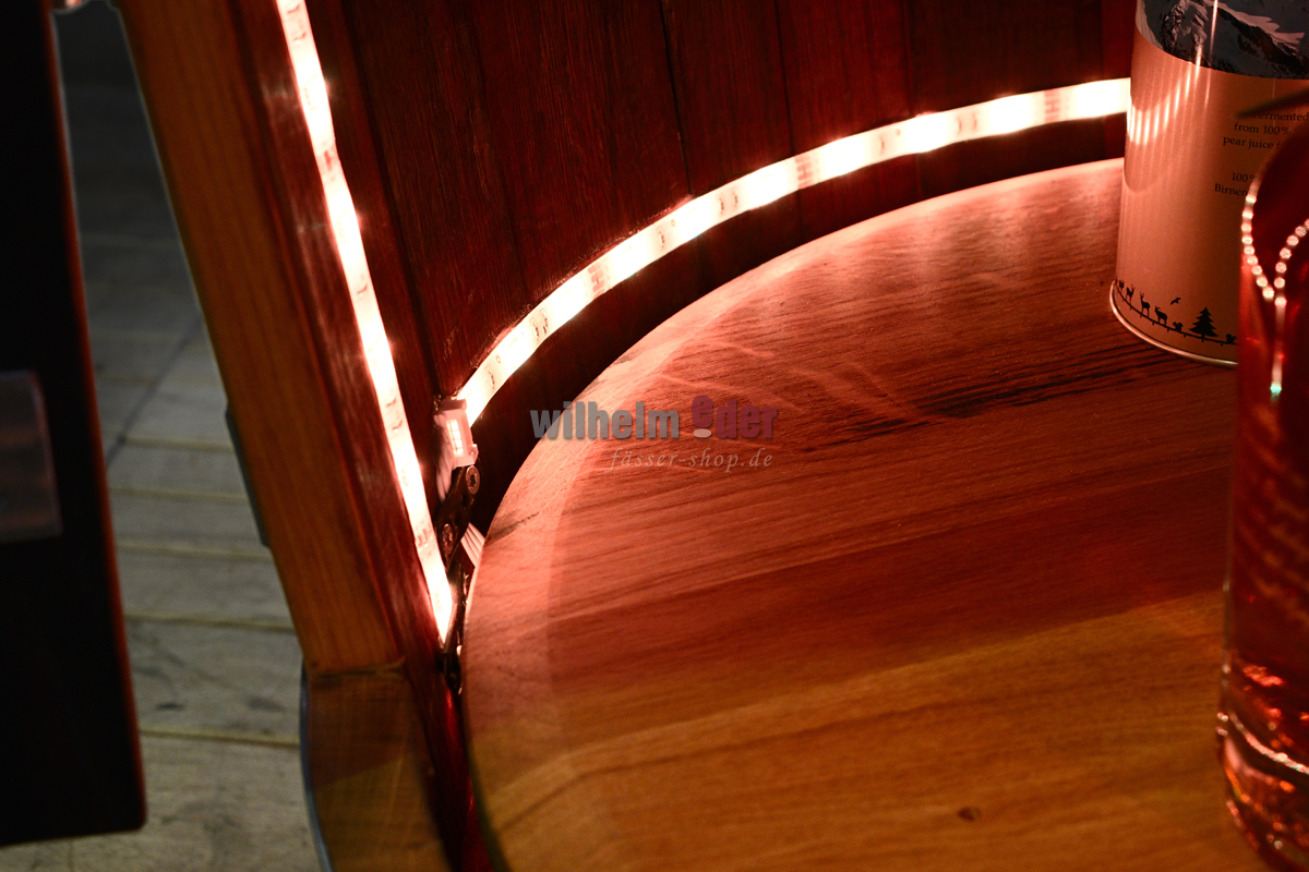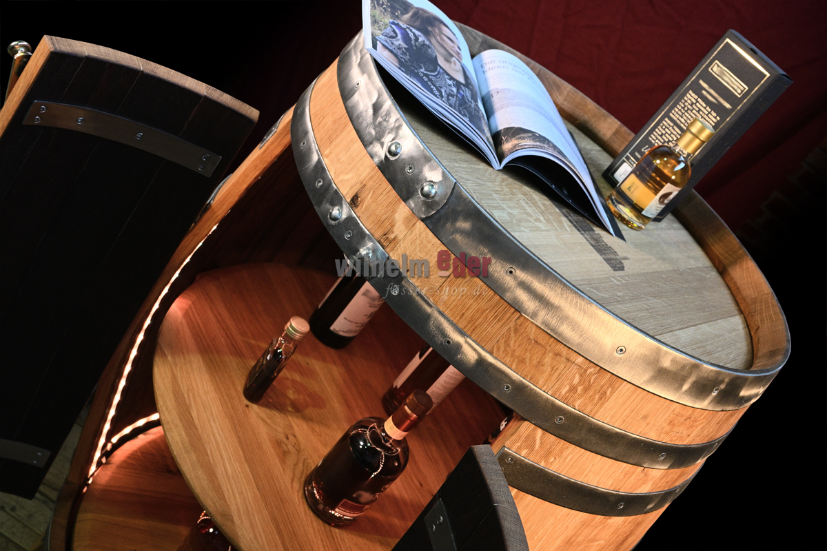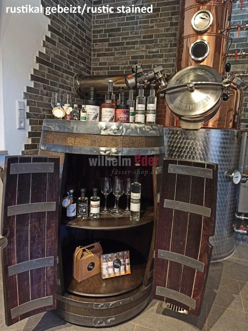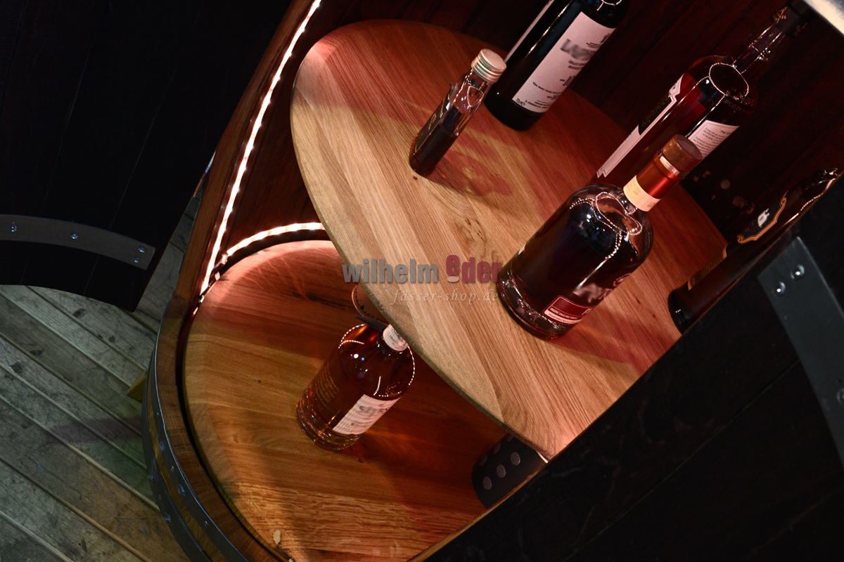 Die zweiflüglige Tür öffnet nach außen. Innen ist das Fass unbehandelt und zeigt eine Rotweinfärbung. Zwei drehbare Regalböden sind das Highlight in dem Fass. Für die richtige Beleuchtung sorgt das eingebaute LED-Band.