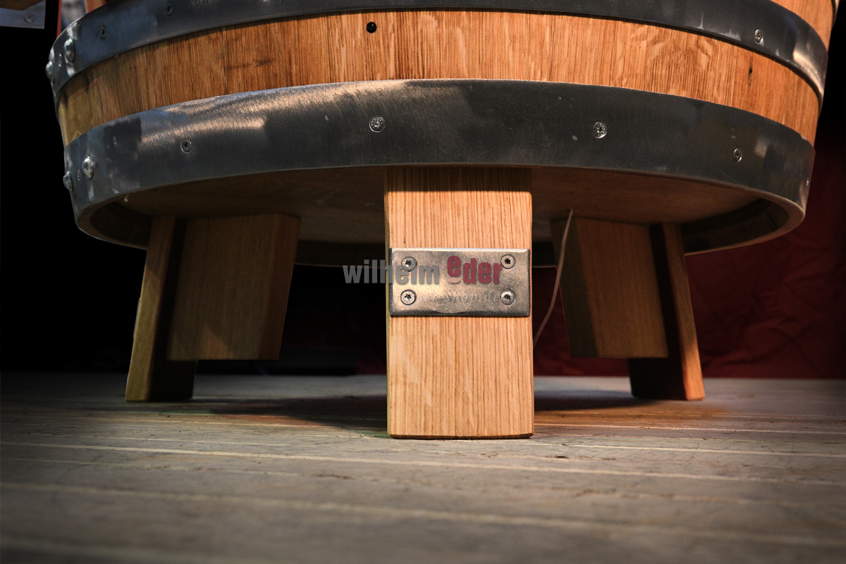 Das Fass ist getrocknet, gesäubert und geschliffen. Jede einzelne Daube wird verleimt und die gebürsteten Reifen sind mit Schrauben fixiert. Durch eine Oberflächenbehandlung mit Leinöl entsteht eine exklusive Optik.