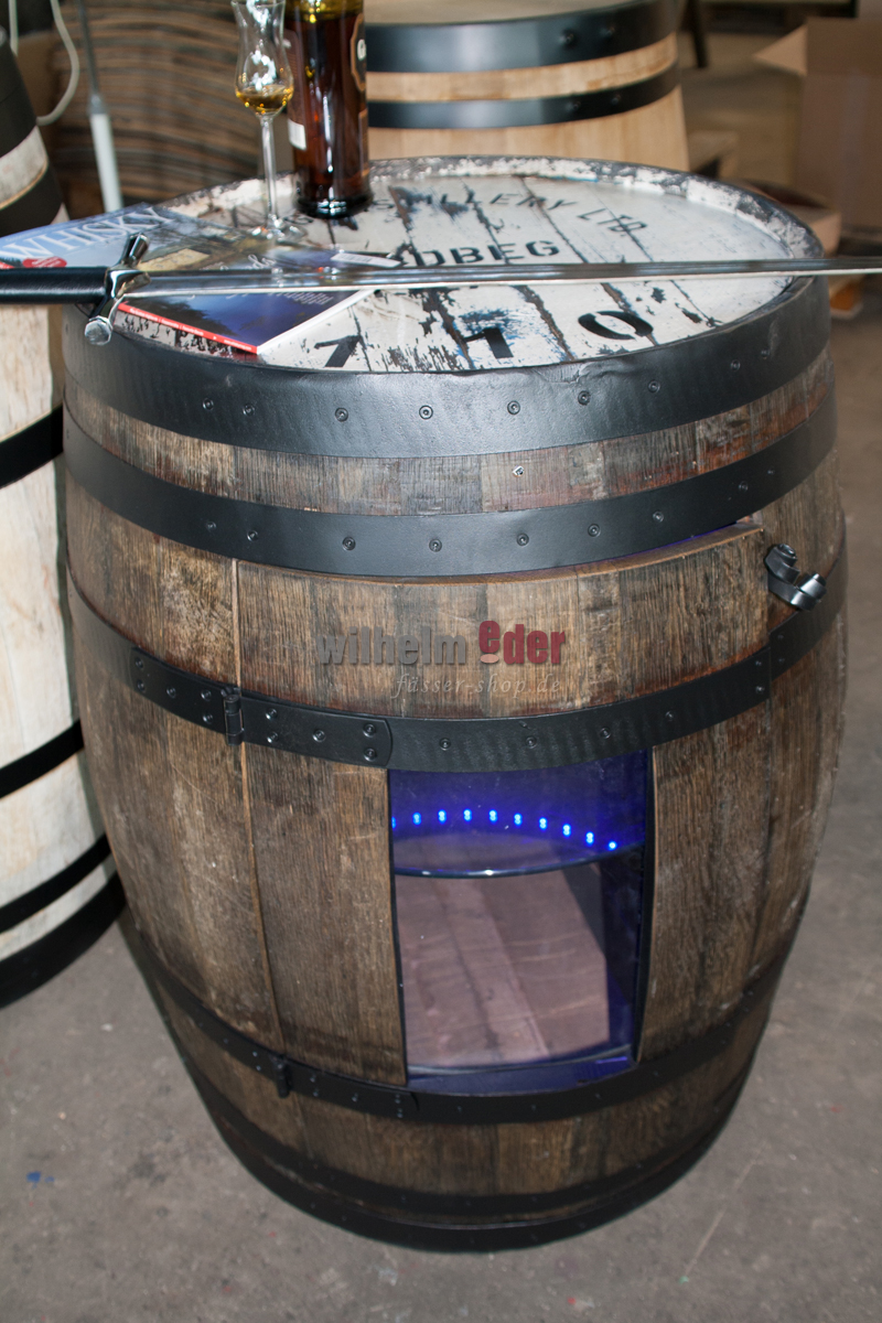 Aus ehemaligen, lang belegten Whiskyfässern, die wir in unserer Werkstatt sorgsam aufbereiten entsteht dieses originelle und originale Regalfass. Das Fass wurde gesäubert und aufgearbeitet und die Reifen schwarz nachgestrichen. Das Fass ist rustikal gebeizt. Ausgestattet sind diese Fässer mit einem Regalboden aus Glas, dieser lässt das innere des Fasses leicht erscheinen. Im Fass ist eine LED Beleuchtung (Fernbedienung inklusive) verbaut, welche es ermöglichst, das Fass in unterschiedlichen Lichtfarben von innen auszuleuchten. Das Fass ist mit einer Tür inkl. Plexiglasscheibe versehen, die Tür schließt mit einem Schnappverschluss. Der Griff der Tür ist aus ehemaligen Fassreifen gefertigt.