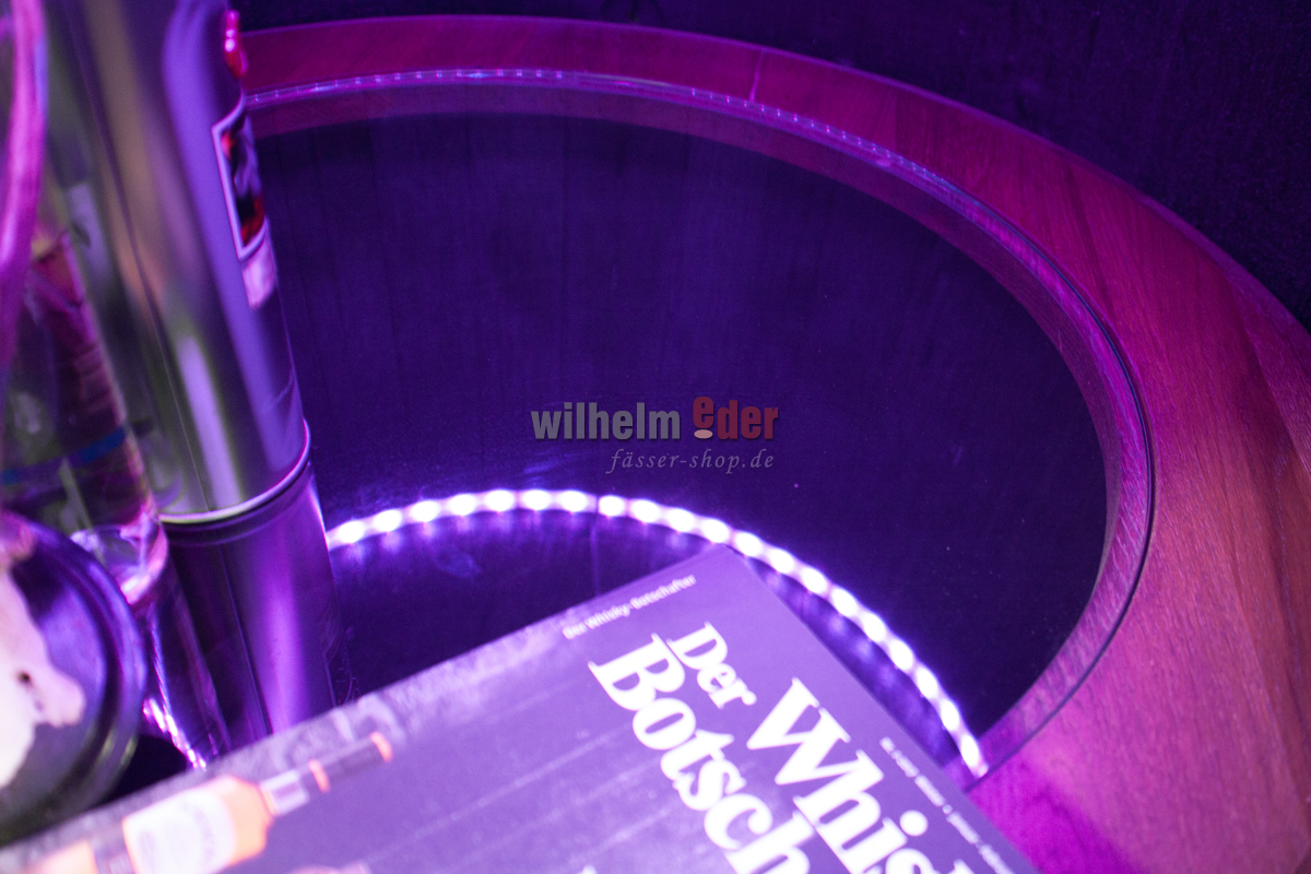 Das Fass ist professionell gesäubert, abgeschliffen, vorne geöffnet und mit einem Regalboden ausgestattet. In den Regalboden ist eine Glasplatte von ca. 57 cm eingelassen. Das Holz wurde zuerst gebeizt und dann mit einem Klarlack überzogen. Auf Wunsch statten wir das Fass mit einem LED Band aus, bei dem man die gewünschte Farbe mit Fernbedienung umstellen kann (unter Zubehör bestellbar).