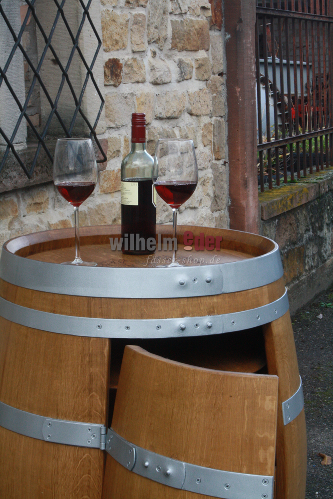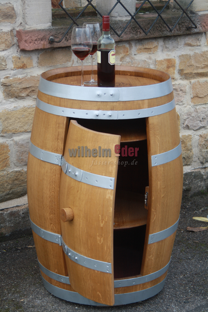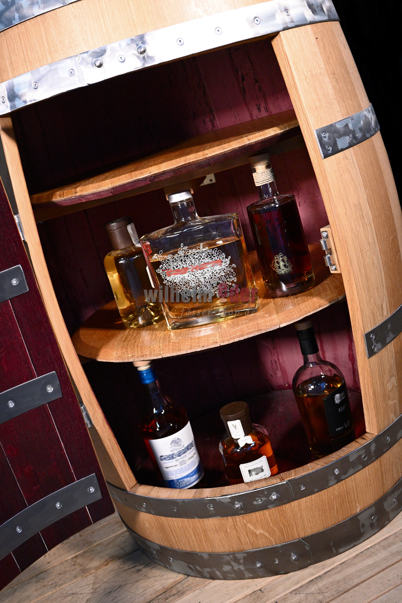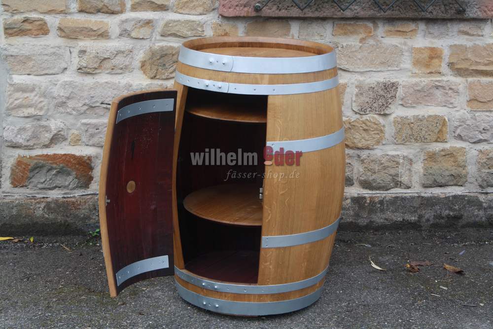 Regalfass aus einem gebrauchten 225 l Barriquefass, durch Meisterhand umgebaut als exklusives Weinlagerregal mit zwei integrierten Barriquefassböden als Abstellfach für Gläser und Flaschen. Die Tür wird mit einer Schnapp-Mechanik ausgestattet, die das Schließen der Tür ohne sichtbares Schloss von außen ermöglicht.