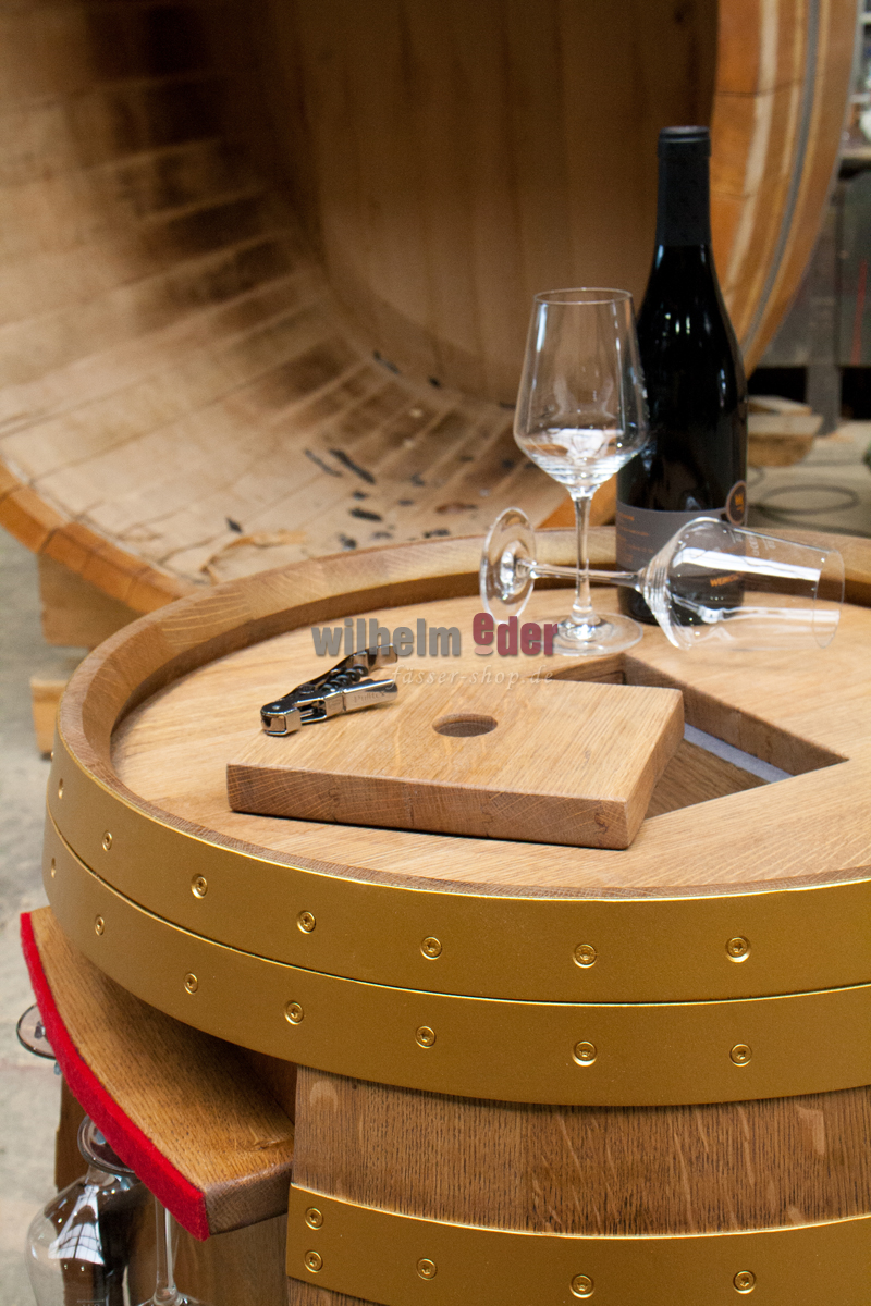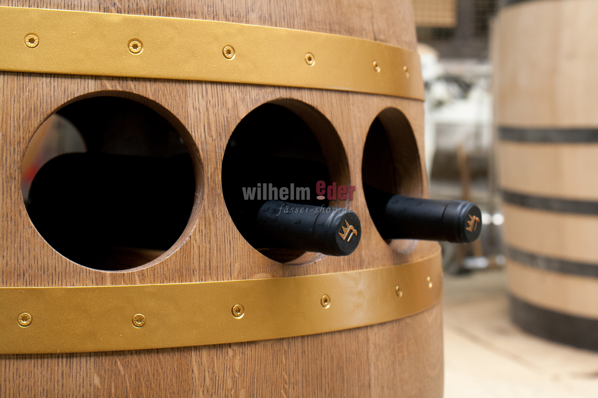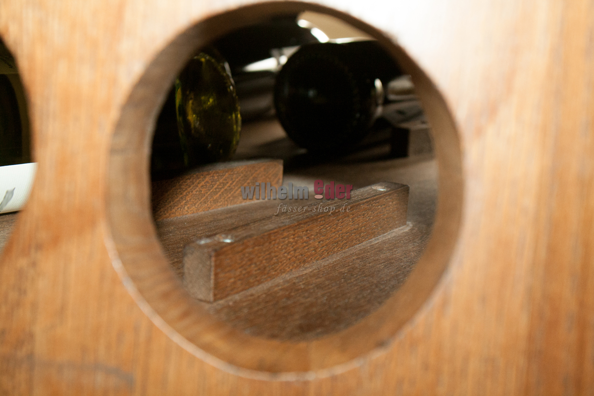 Das Fass wurde professionell gereinigt, danach getrocknet und verleimt. In das Fassinnere ist ein Regalsystem für Weinflaschen mit Auflage bis zu einem Inhalt von 150 cl eingebaut. Das Regal ist ebenfalls aus Eiche produziert.