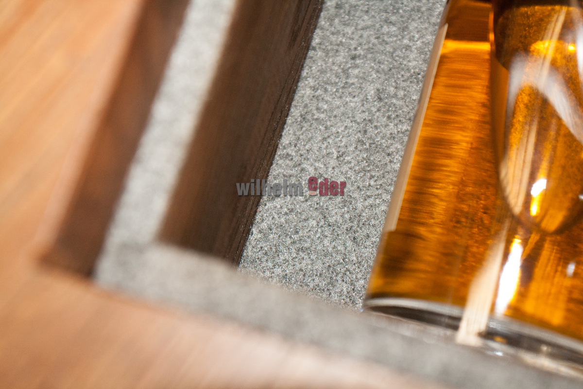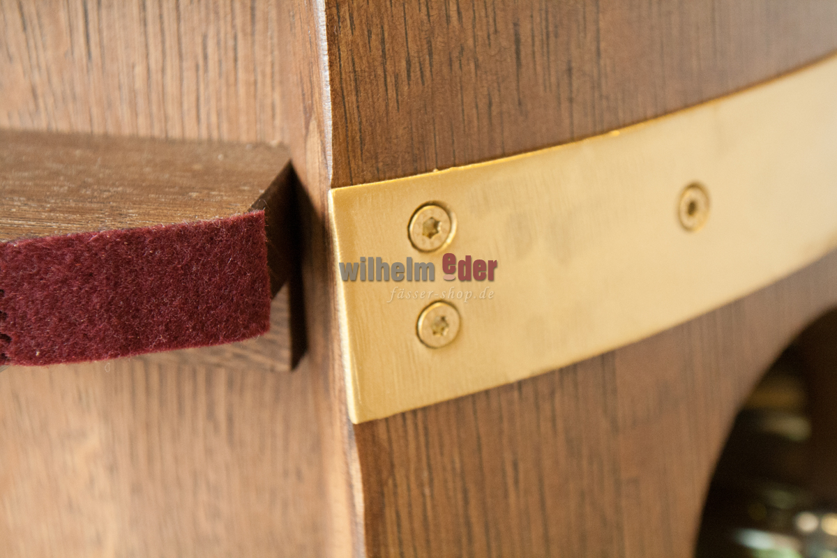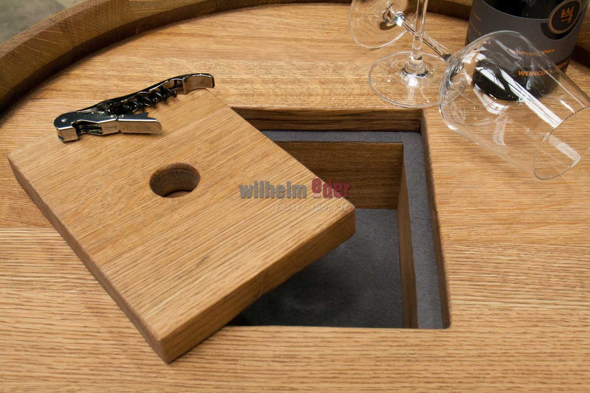 Im Deckel des Fasses, auf den auf Wunsch auch Ihr Name und Ihre Widmung gelasert werden kann, haben unsere Handwerker ein Fach für die nützlichen Dinge wie Korkenzieher, Dropstop oder Servietten geschaffen. Das Fass, wie auch die Auflagenkanten für den Deckel, sind mit grauem Filz ausgelegt, das erzeugt eine warme und geräuscharme Haptik.