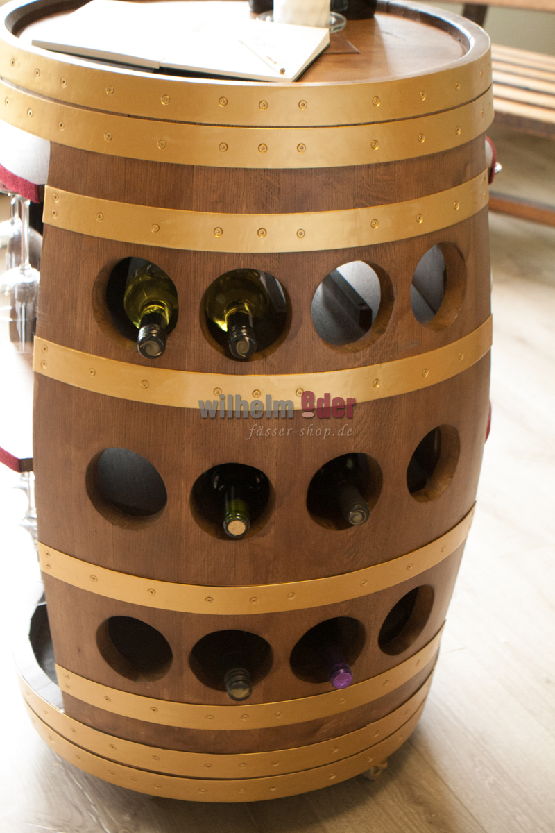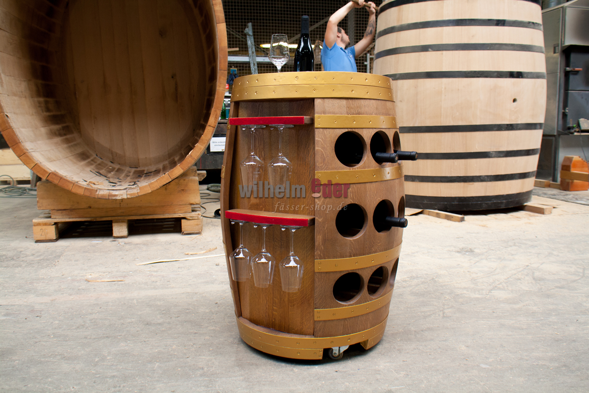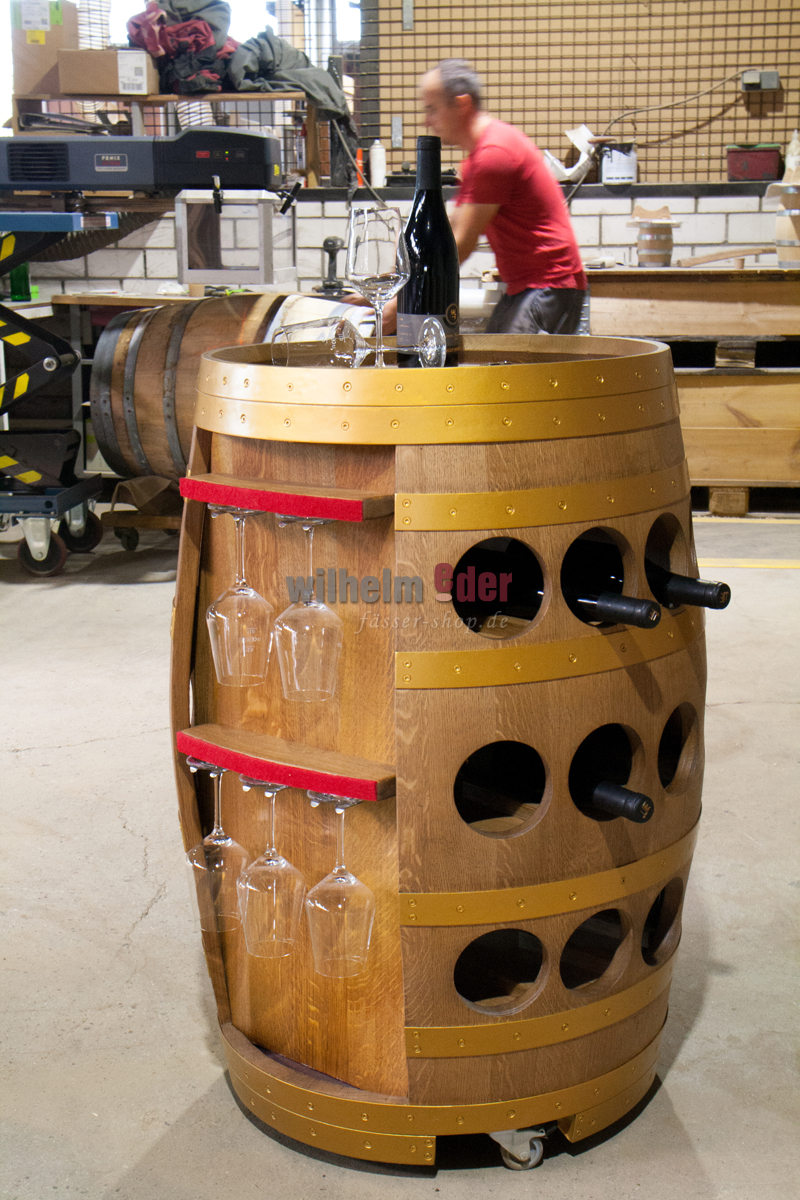 Ein exklusives Weinregal, hergestellt aus einem gebrauchten 225 l Weinfass, welches in aufwendiger Handwerksarbeit in eine mobile, schwere Weinbar umgebaut wurde.