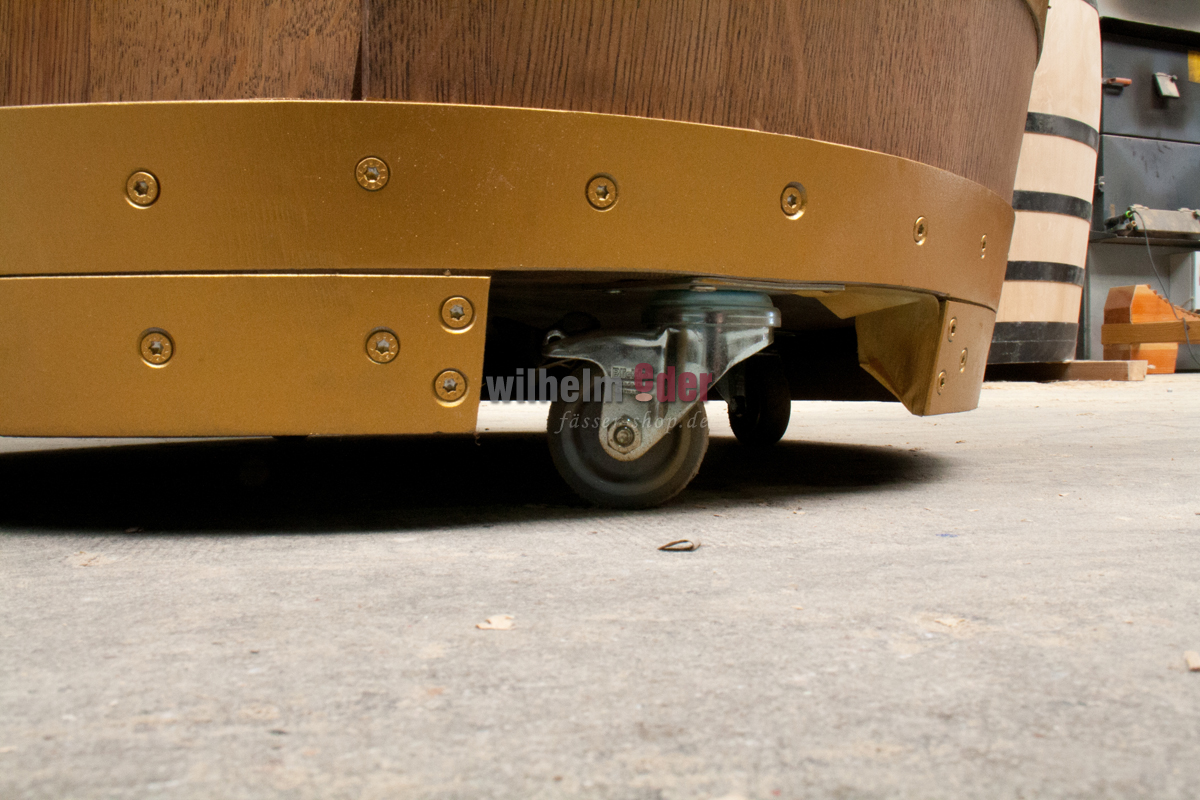 Das Regalfass ist auf gummierten Rollen für ein geräuscharmes und laufruhiges Fortbewegen der Bar gelagert. Eine Feststellbremse ist integriert.