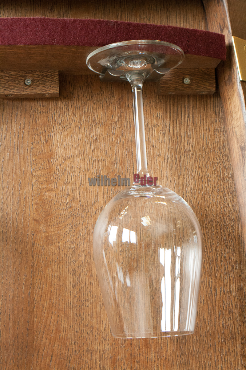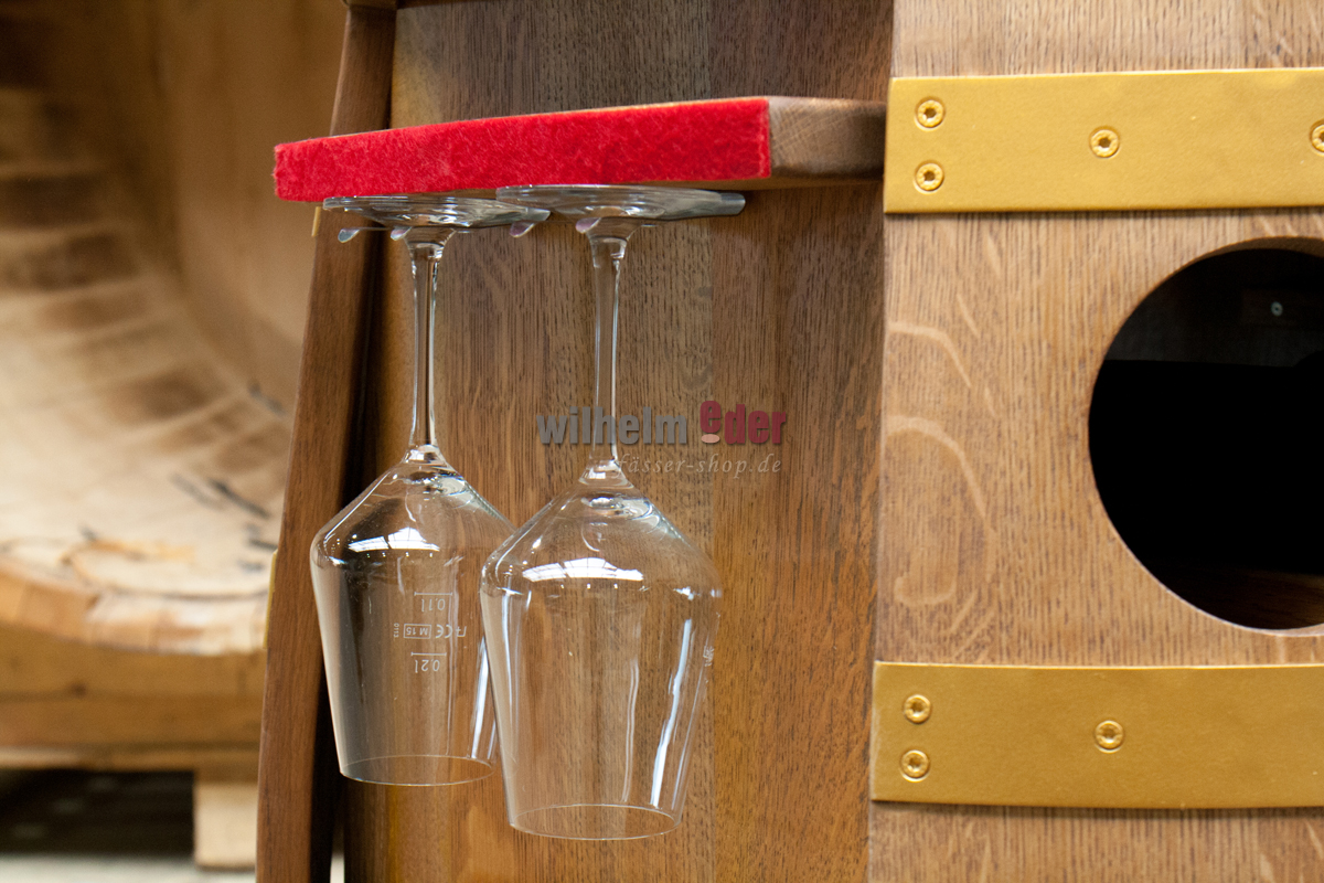 Seitlich geöffnet bietet das Regalfass Platz für jeweils 5 Weingläser die aufgehängt umfallsicher aufbewahrt und bewegt werden können. Die Kanten der Glasregale sind mit edlem Filz in Bordeauxrot belegt.