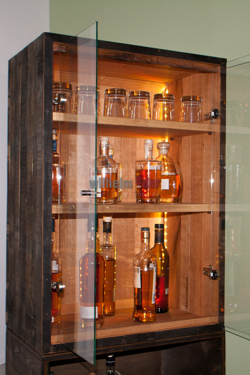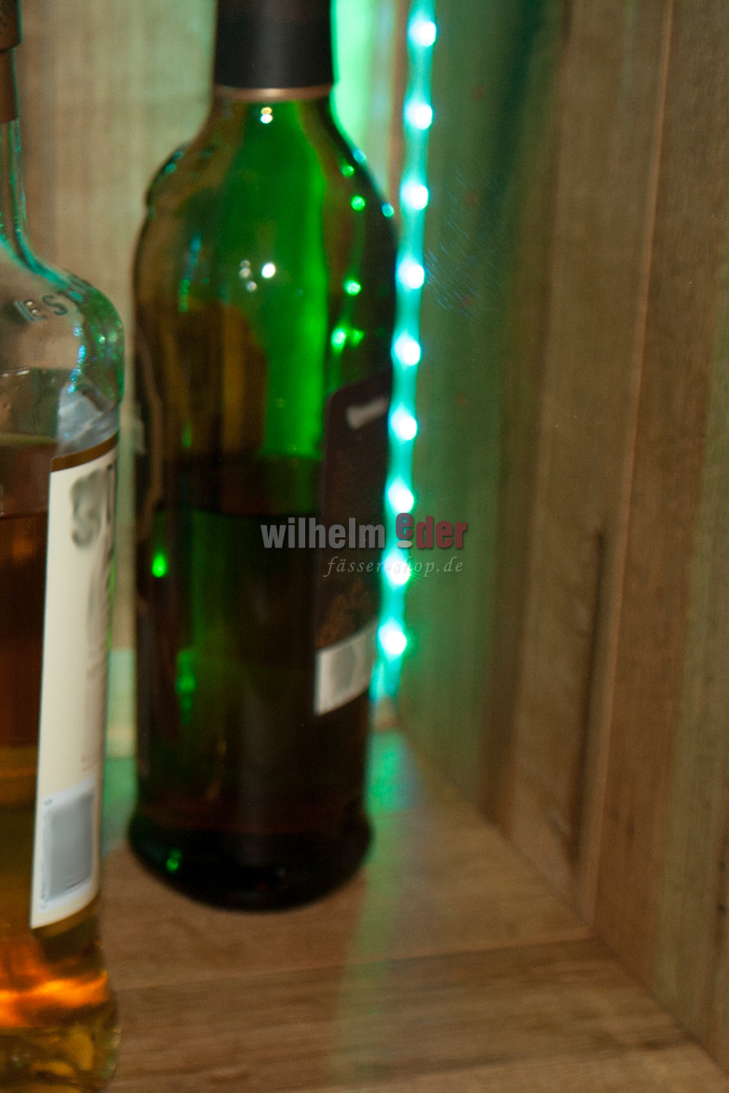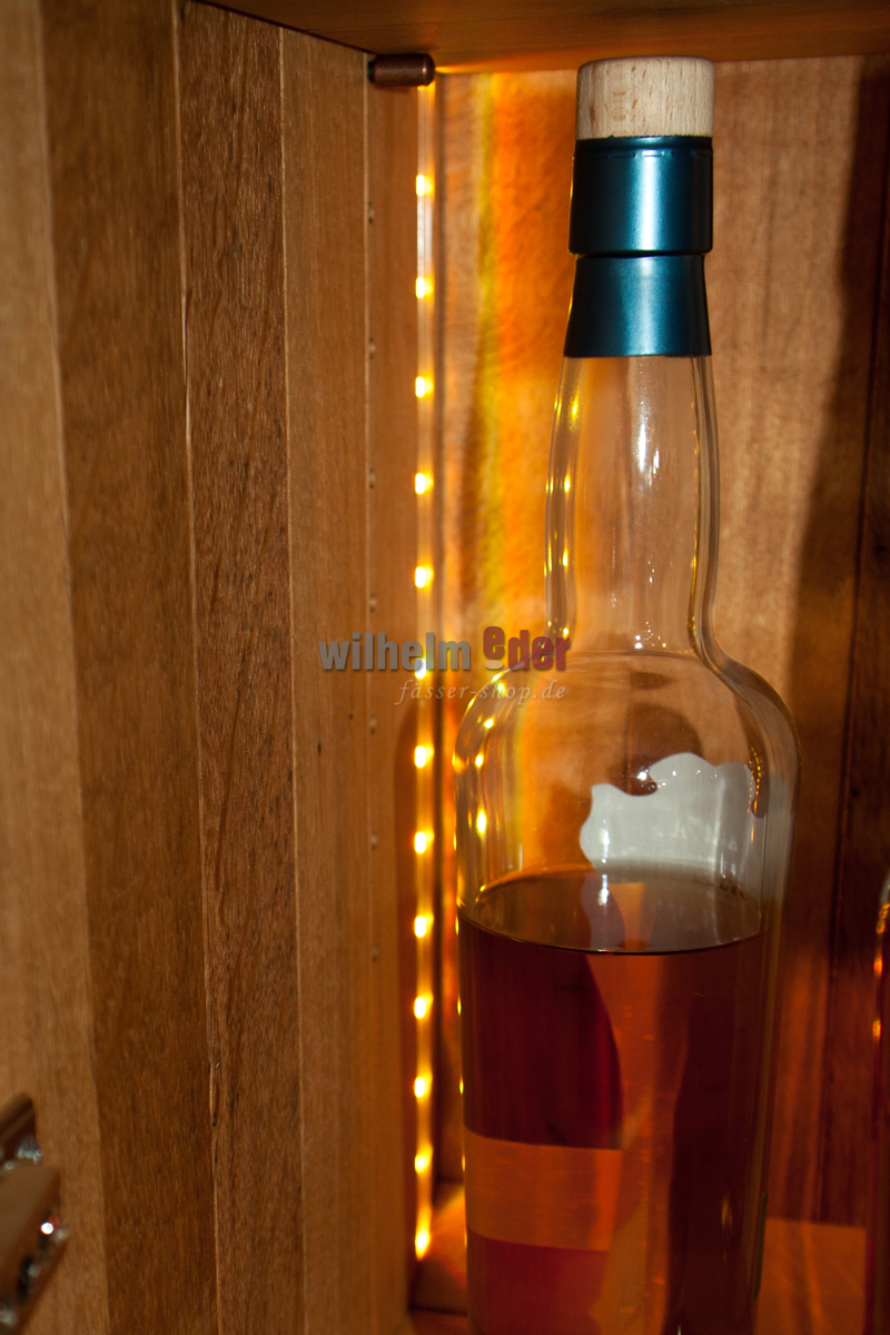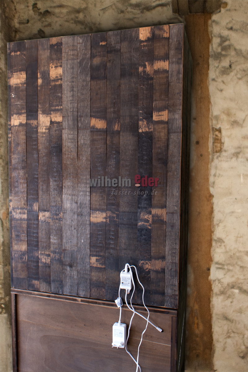 Durch das Interieur aus hellen Dauben kommt Ihr Whisky, Rum, Bourbon oder andere Destillate erst richtig zur Geltung. Das Starkfurnier, aus dem der Schrank gebaut ist, wurde aus alten Destillatfässern gefertigt. Außen ist dieses Highlight mit dunklen Dauben belegt. Optional kann die Bar mit einem LED Band ausgestattet und aufgewertet werden.