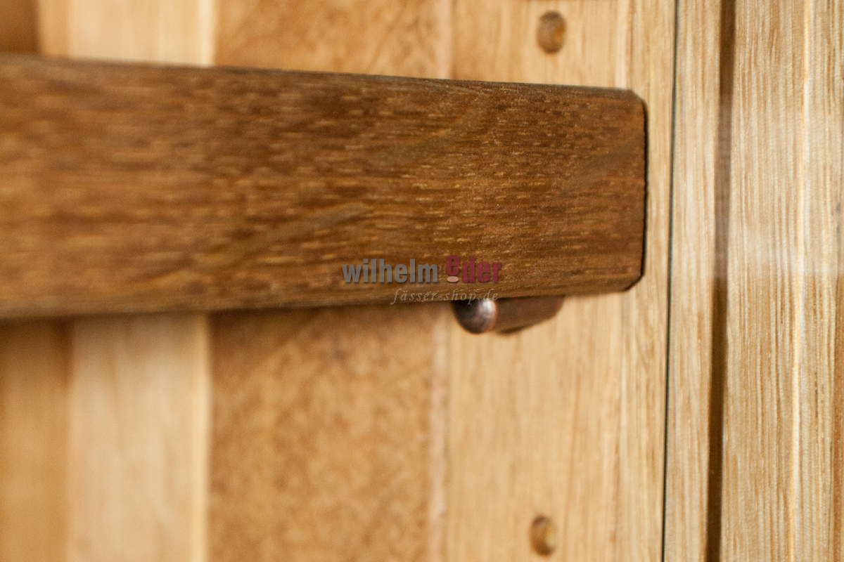Vor der Herstellung von Regalen lassen wir die Fässer trocknen und verleimen die Dauben einzeln. Dieser aufwendige Prozess gewährleistet die Stabilität des Regals und verhindert, dass das Holz sich aufgrund Temperaturschwankungen verzieht. Bitte beachten Sie trotzdem, dass allzu trockene und warme Heizungsluft dem Fass nicht guttut.