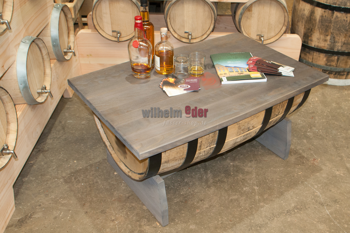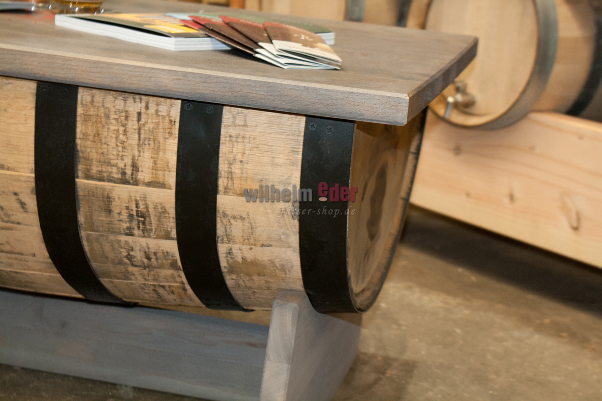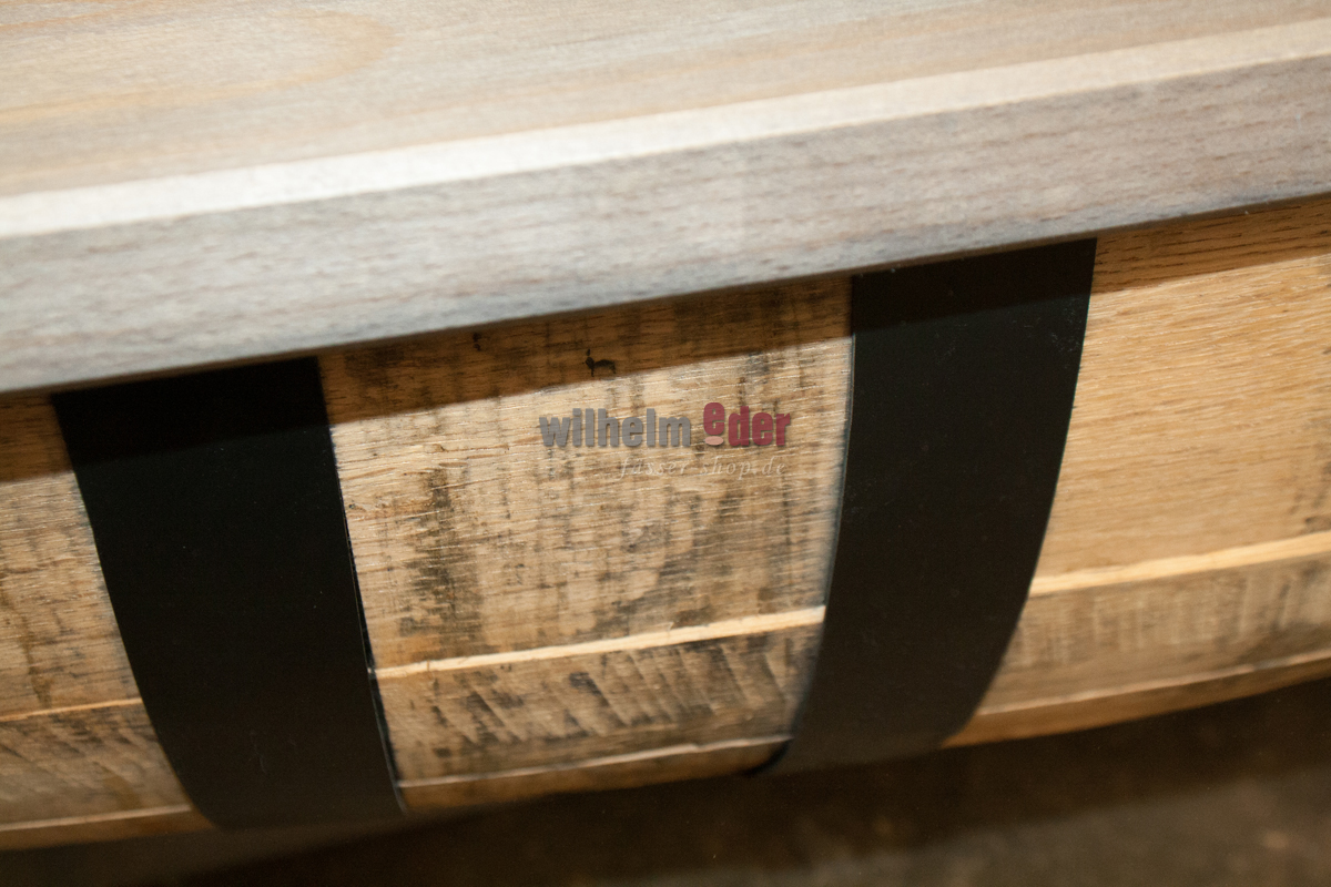 Der Tisch ist produziert aus einem halben originalen Bourbonfass, das längsseitig geteilt und verleimt wurde. Darauf wurde eine Tischplatte aus massiver Buche installiert. Der Tisch selbst wird auf zwei Fasslager montiert. Seitlich und auf der Platte kann optional ein Laserbranding aufgebracht werden.