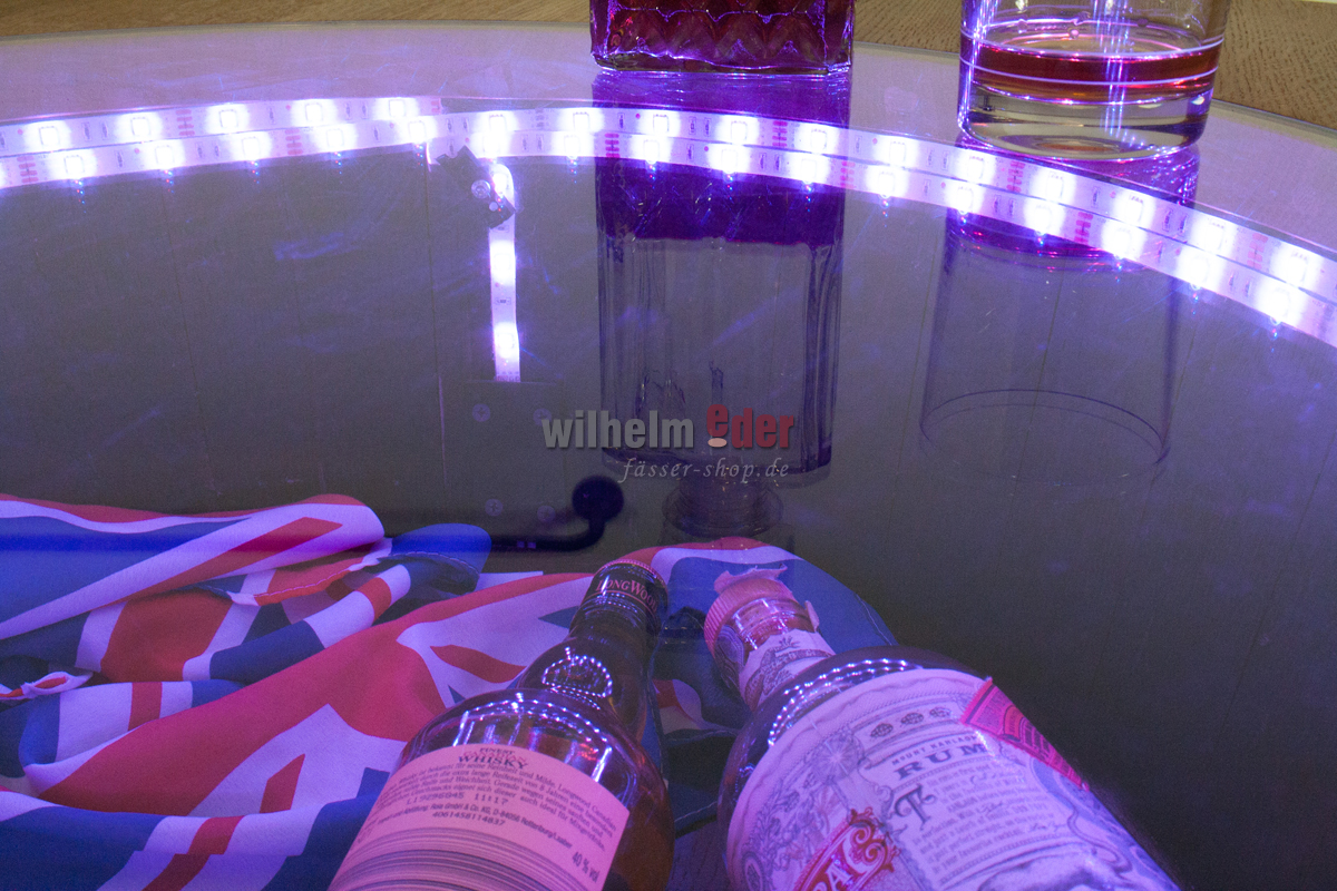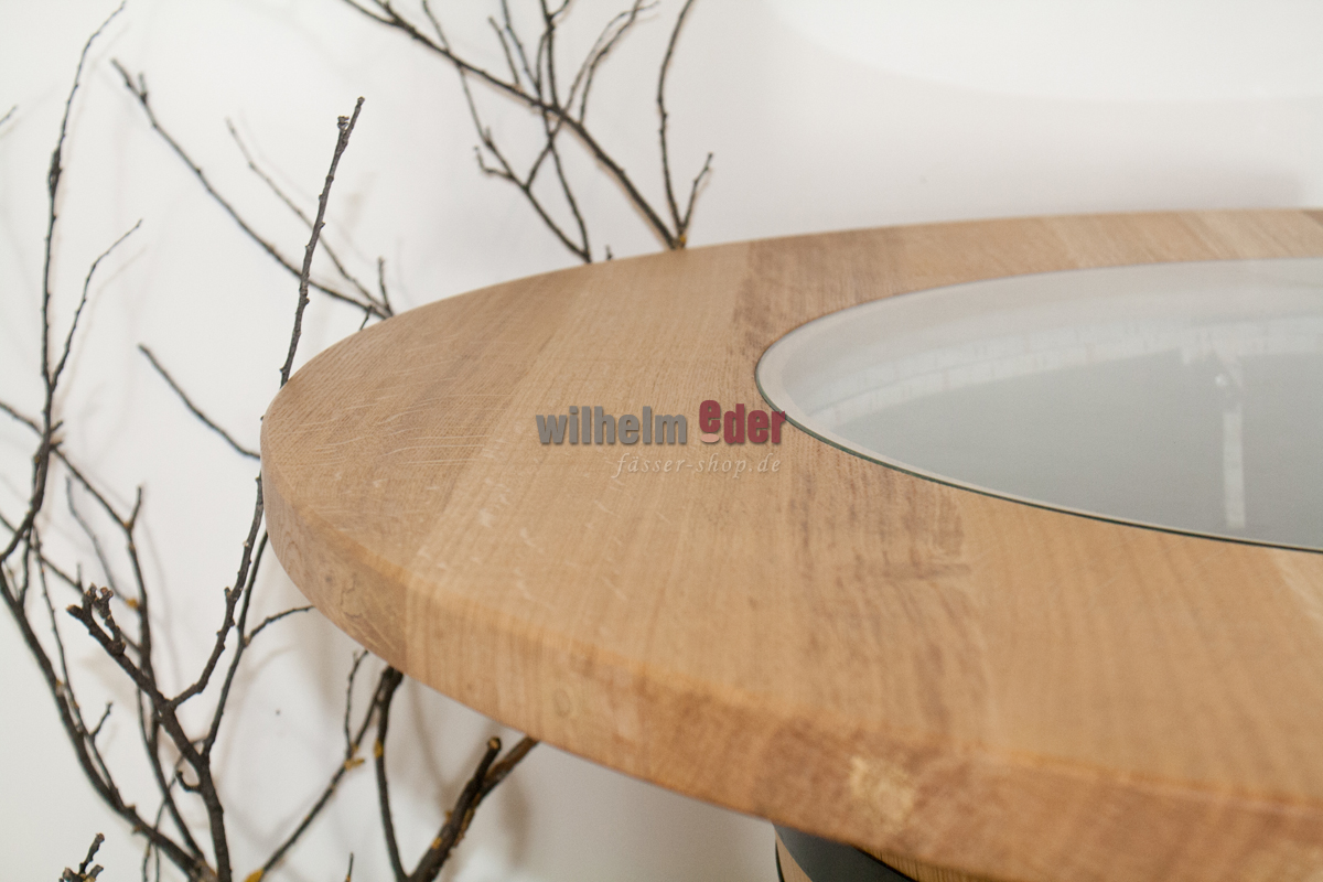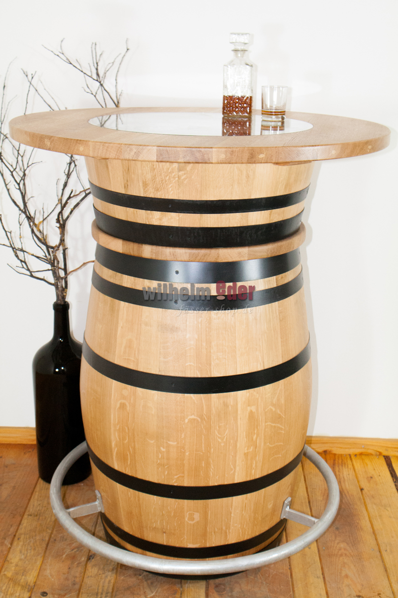 Dieser außergewöhnlich schöne Stehtisch wird aus einem 225 l gebrauchten und aus einem on top aufgesetzten viertel Barriquefass gefertigt. Das komplette Fass ist abgeschliffen und mit Klarlack überzogen. Die verzinkten Fassreifen sind schwarz gestrichen. In die runde Tischplatte aus Eichenholz ist eine Glasplatte eingelassen, sodass man das Oberteil als „Schaukasten“ verwenden kann. Eine innere LED-Lichterkette mit Farbwahl per Fernbedienung macht das Fass zu einem optischen Highlight.