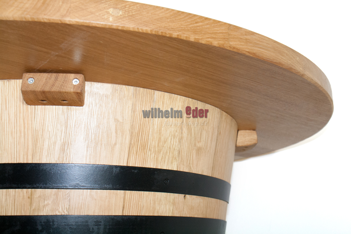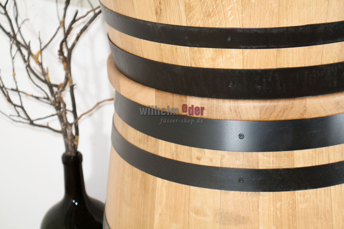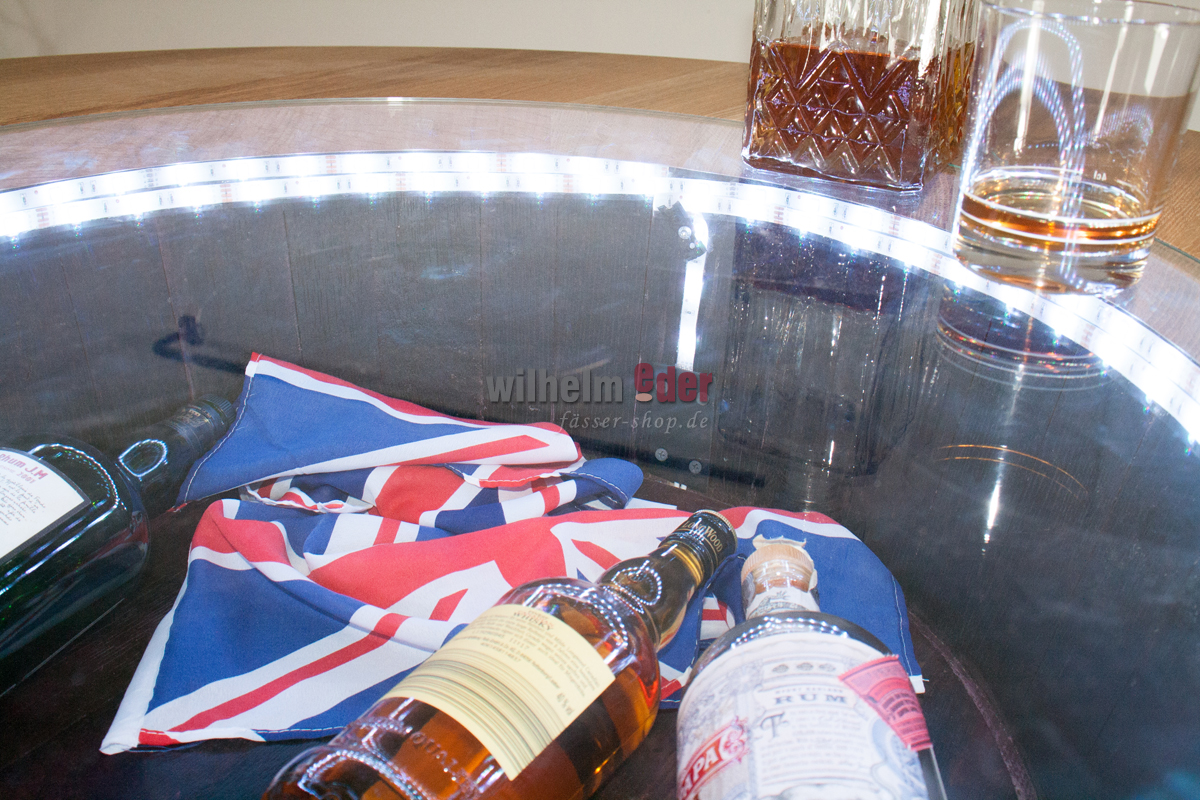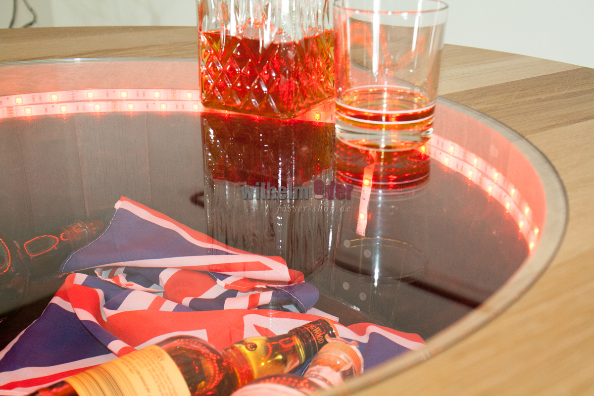 Dieser außergewöhnlich schöne Stehtisch wird aus einem 225 l gebrauchten und aus einem on top aufgesetzten viertel Barriquefass gefertigt. Das komplette Fass ist abgeschliffen und mit Klarlack überzogen. Die verzinkten Fassreifen sind schwarz gestrichen. In die runde Tischplatte aus Eichenholz ist eine Glasplatte eingelassen, sodass man das Oberteil als „Schaukasten“ verwenden kann. Eine innere LED-Lichterkette mit Farbwahl per Fernbedienung macht das Fass zu einem optischen Highlight.