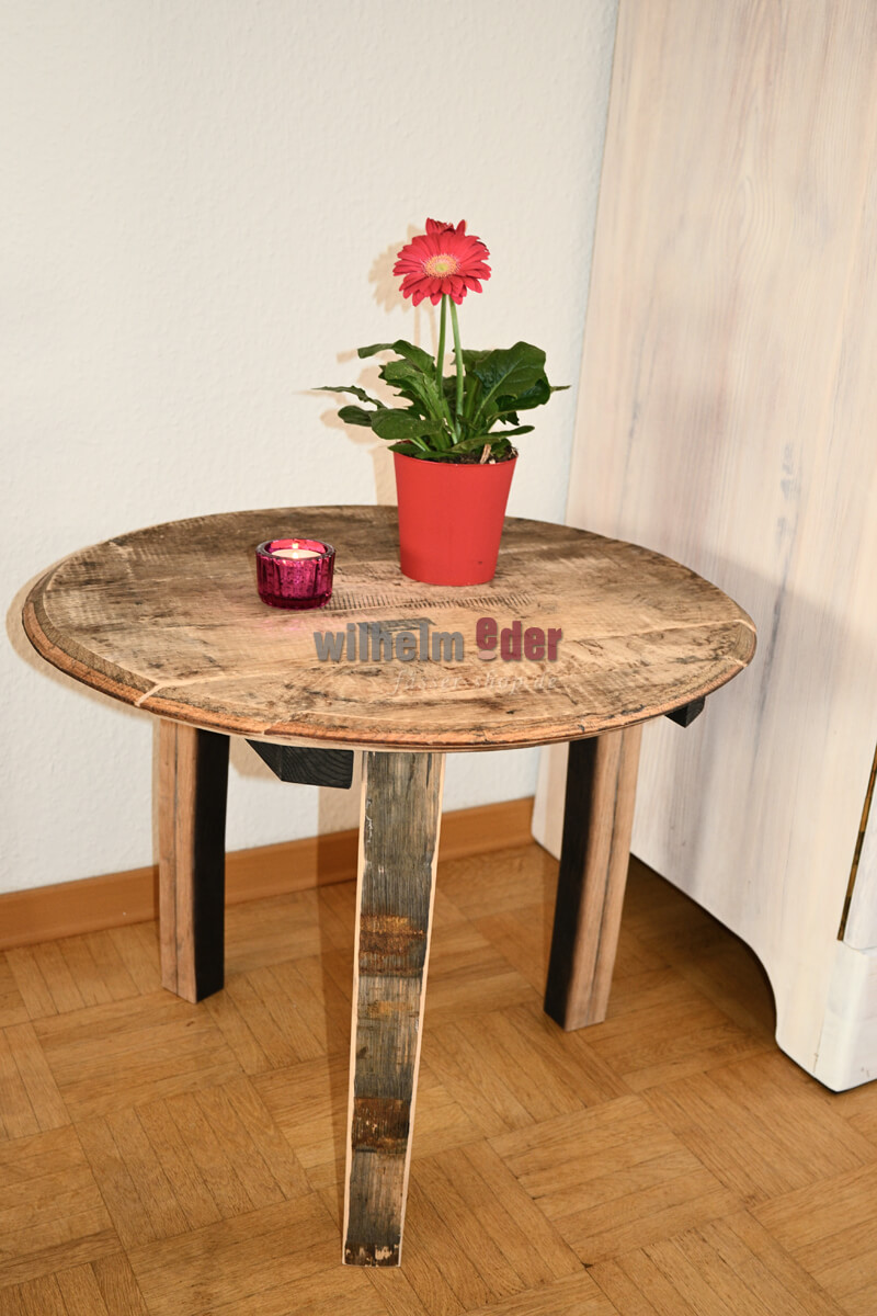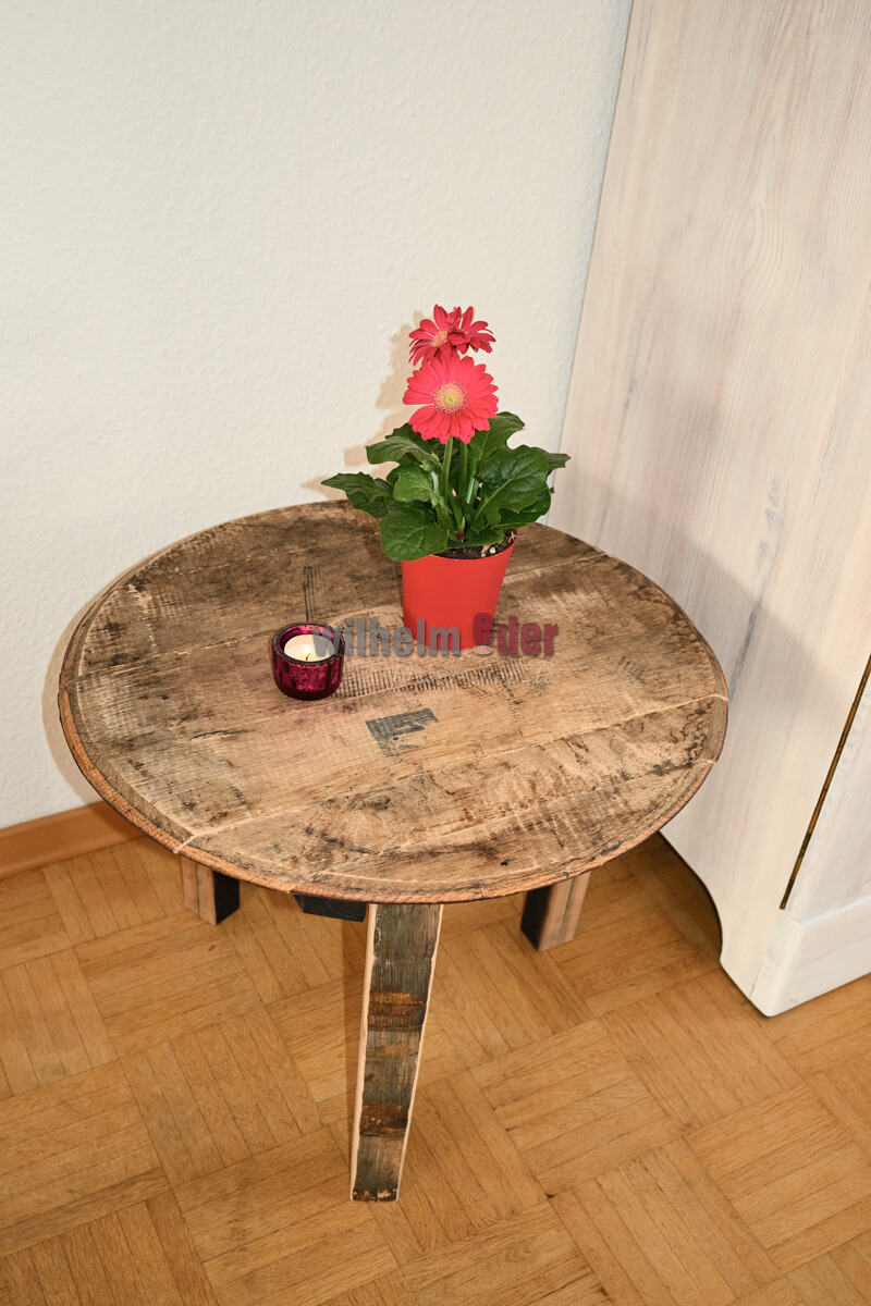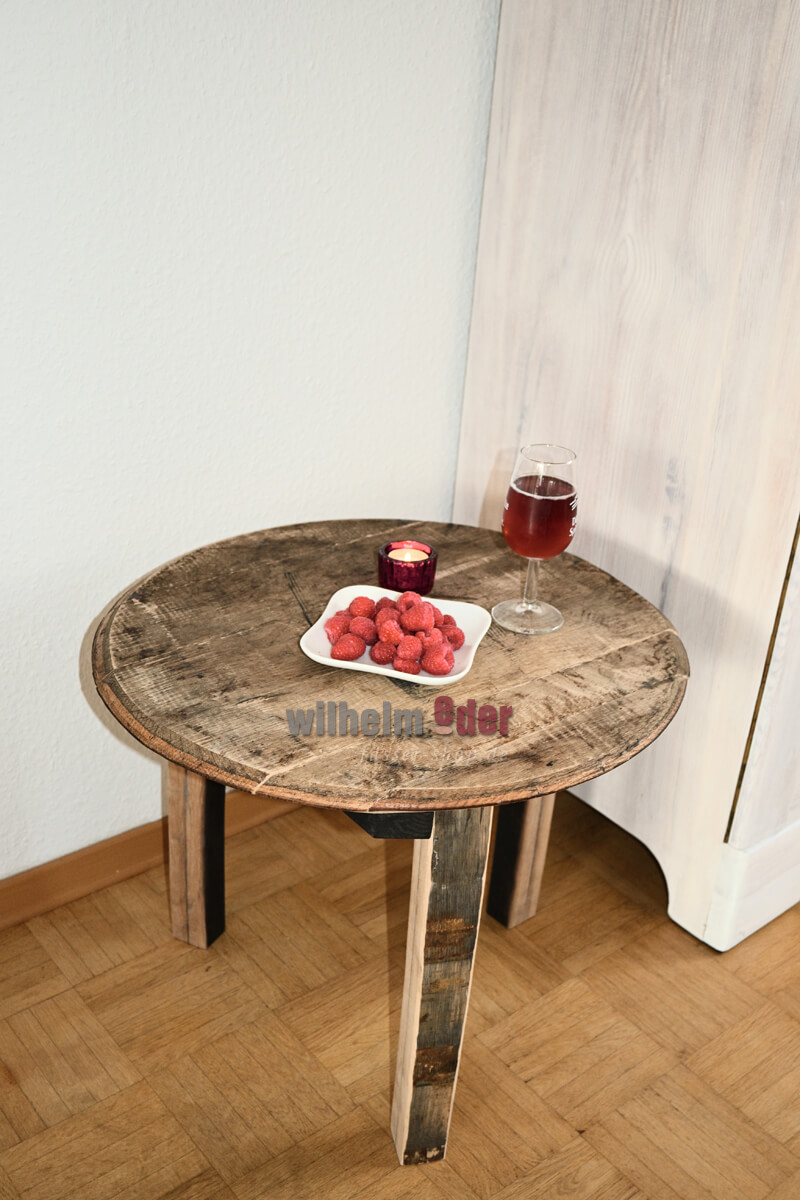 Unsere Beistelltische werden aus verschieden Teilen eines Holzfasses gefertigt.