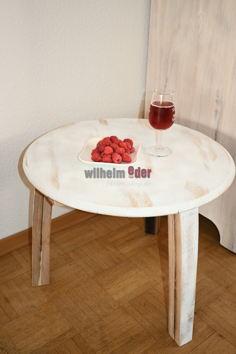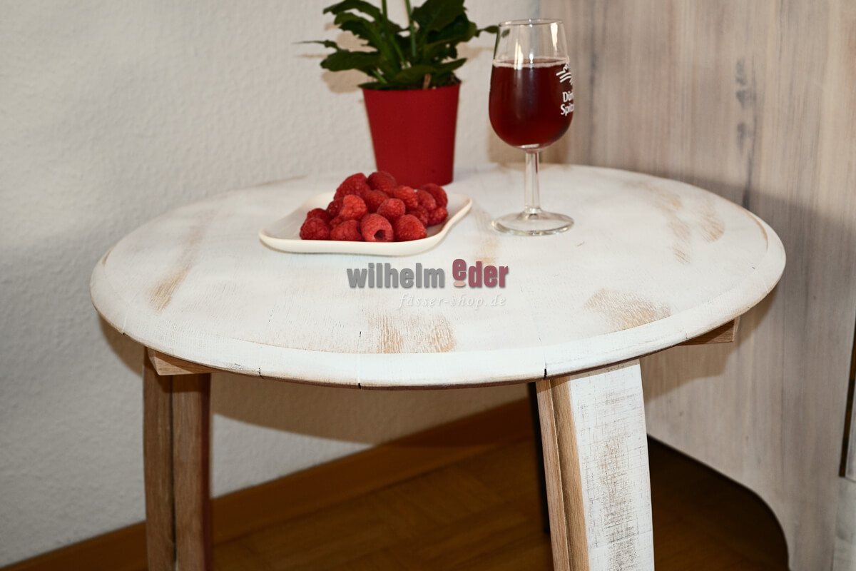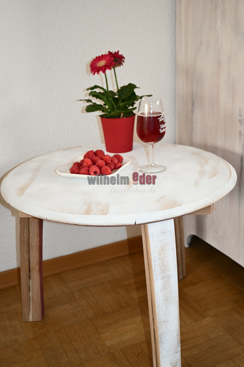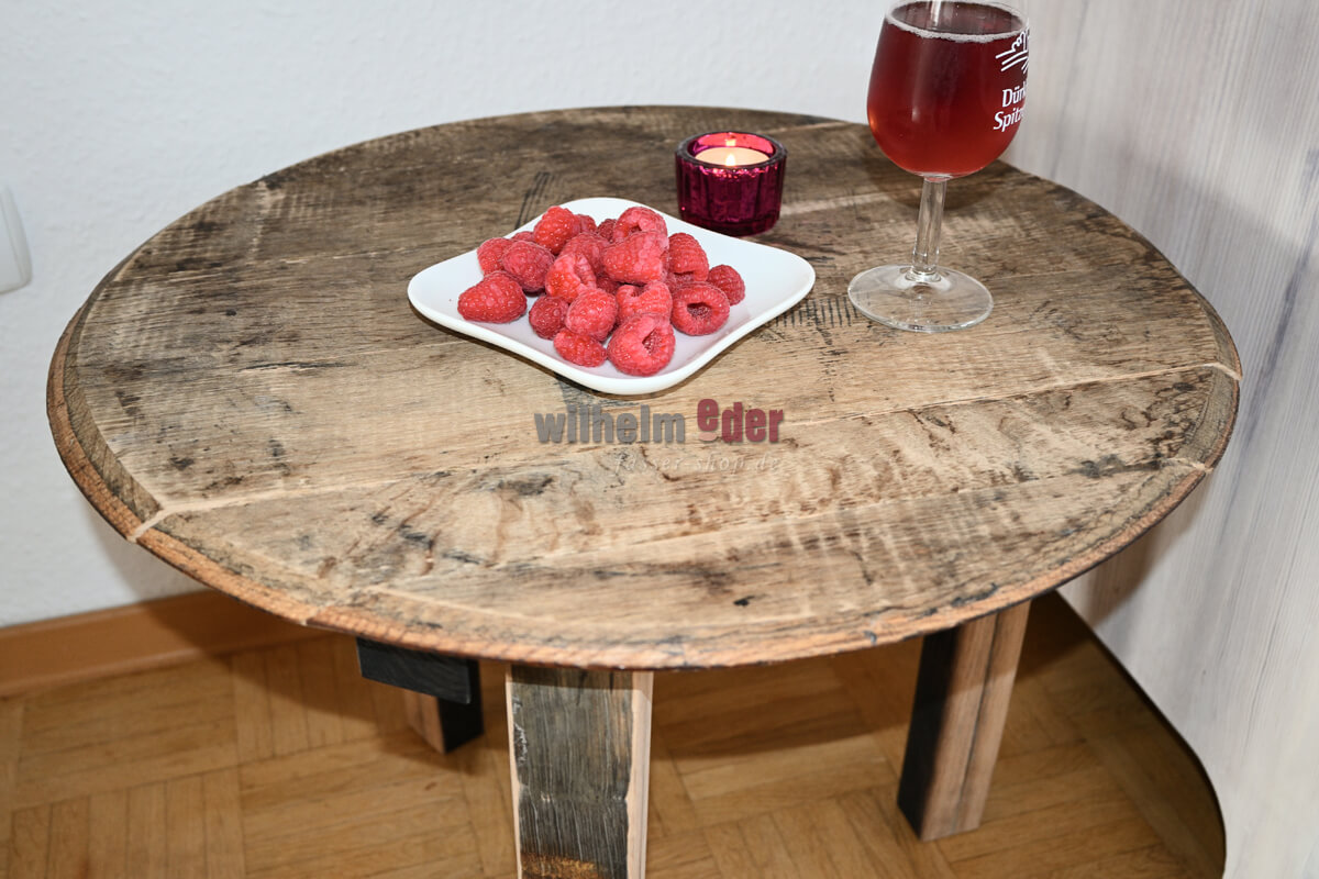 Unsere Beistelltische werden aus verschieden Teilen eines Holzfasses gefertigt.