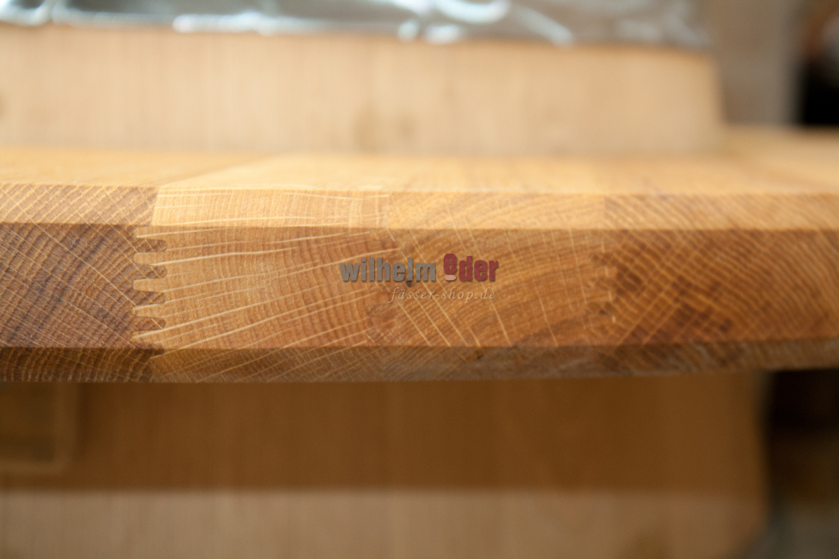 Wir produzieren jede Tischplatte individuell in unserer Fass-Schreinerei. Das Eichenholz wird getrocknet, die Dauben genutet und verleimt und die Kanten gefast. Das anschließende Hobeln, Verschleifen und Ölen der Tischplatte runden die schöne Optik ab.