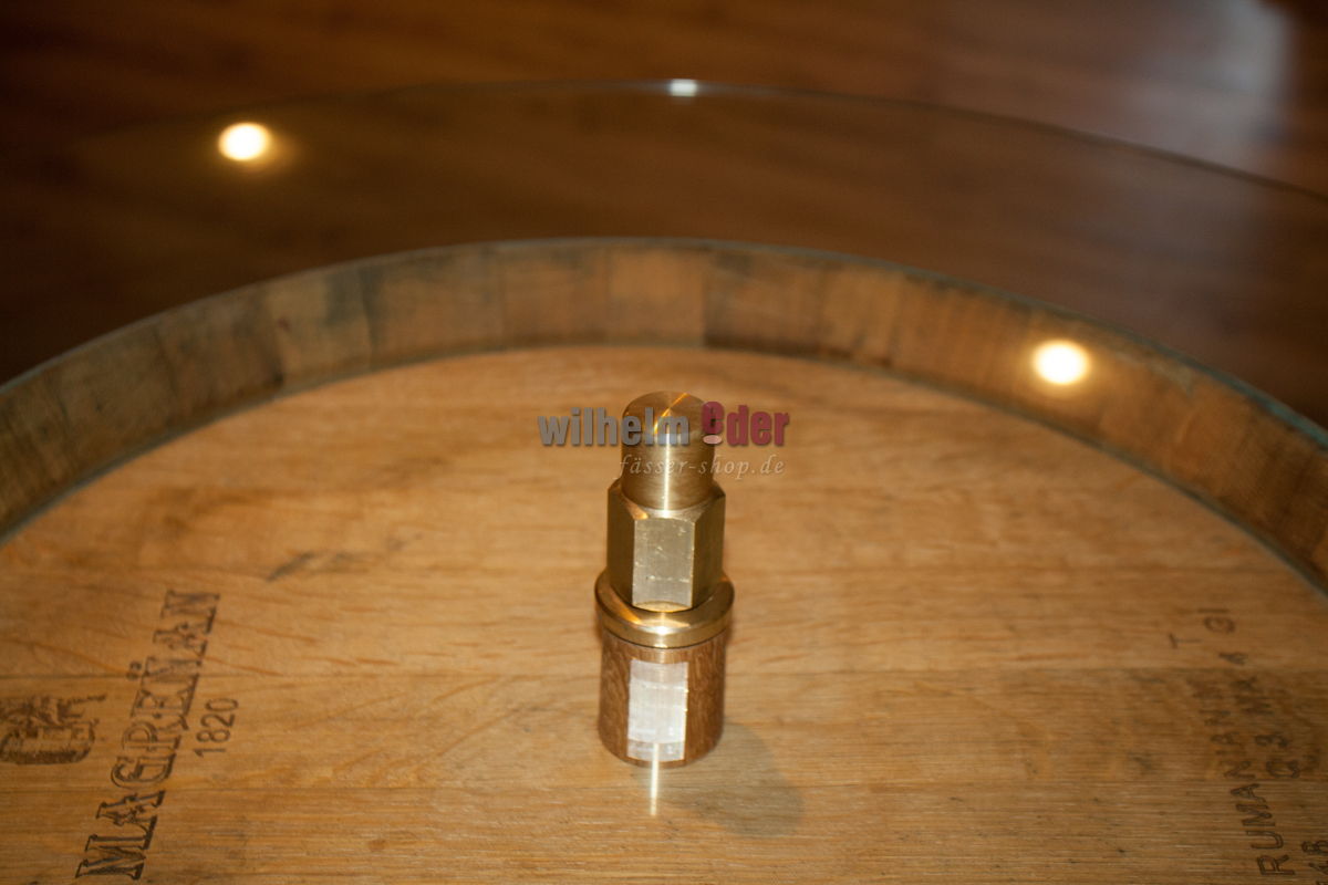 Zunächst wird der Fassdeckel dem Fass fachmännisch entnommen und mittig eine 10 mm starke Bohrung platziert. Das Edelstahlgewinde wird von unten in den Holzfassdeckel gesetzt und dieser wieder im Fass fixiert. Anschließend wir die runde Glasplatte, die mit einer Bohrung ausgestattet ist, auf das Edelstahlgewinde aufgesetzt. Darauf kommt der Messing-Kunststoffring und abschließend wird die Schraube mit der Messingmutter fixiert.