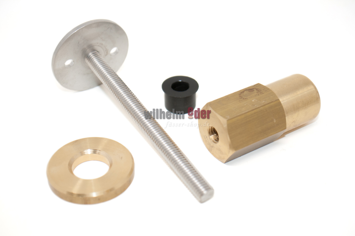 Die Fassschraube aus Edelstahl mit Messingmutter, gewährleistet eine optisch elegante Option, der Fixierung einer Glasplatte auf einem Holzfass.