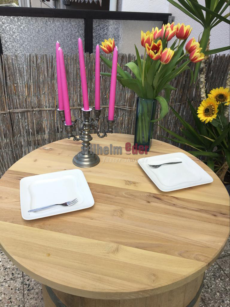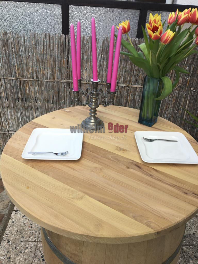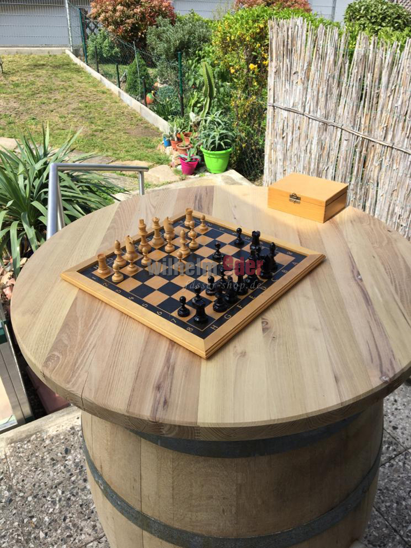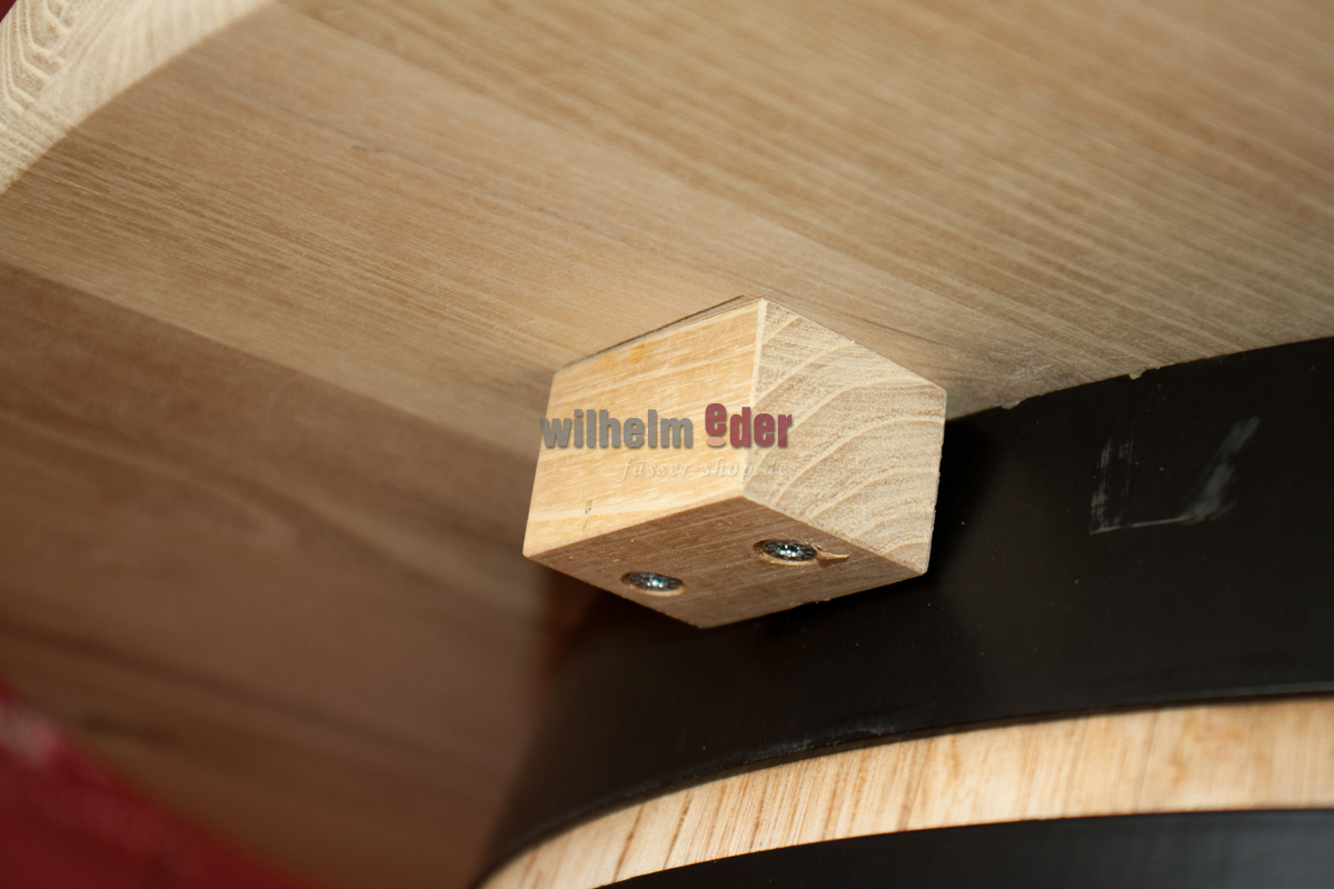 Unterseits sind bei der Platte drei kleine Holzblöcke fixiert, was das Auflegen auf ein 225 l Fass ermöglicht.
