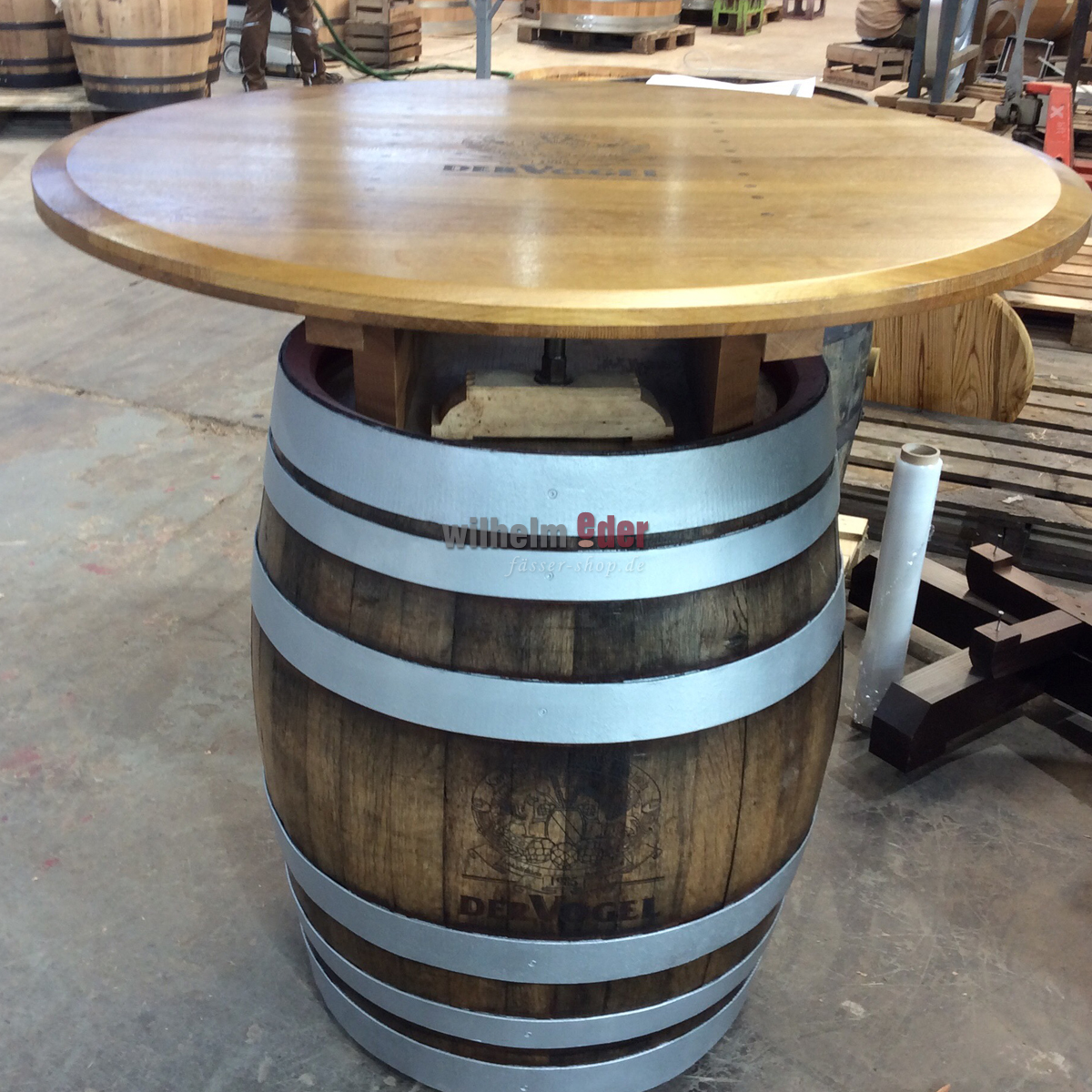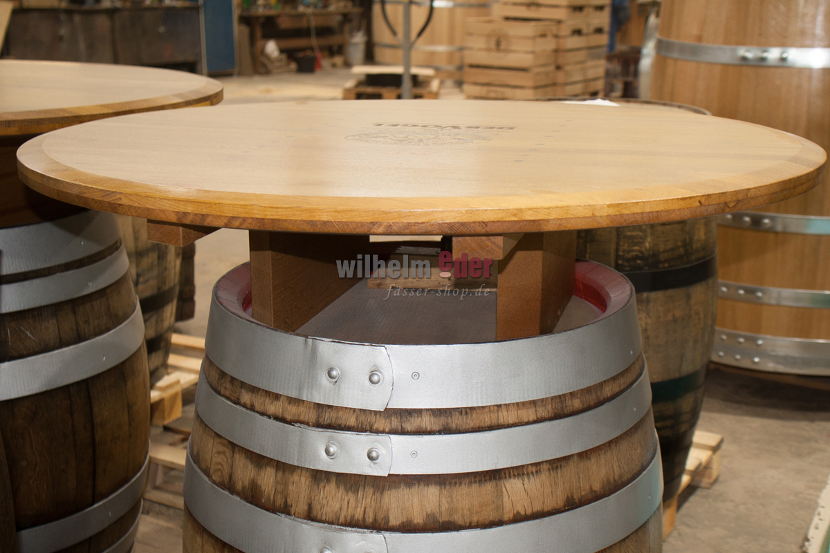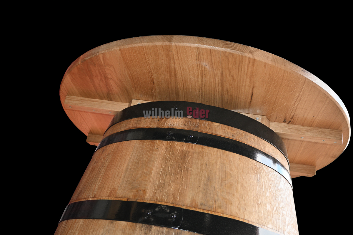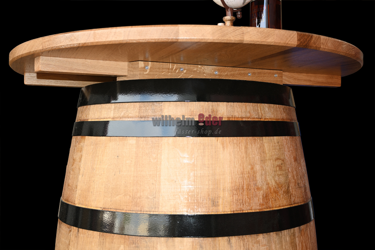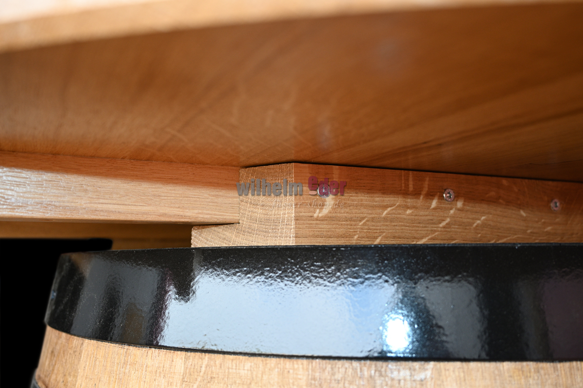 Durch die Eichenholzkonstruktion kann man die Höhe einer Tischplatte eines Regal- oder Dekofasses auf eine angenehme Stehhöhe aufstocken. Dem gewünschtem Fass wird die Tischplatte und der Unterbau kundenindividuell angepasst.