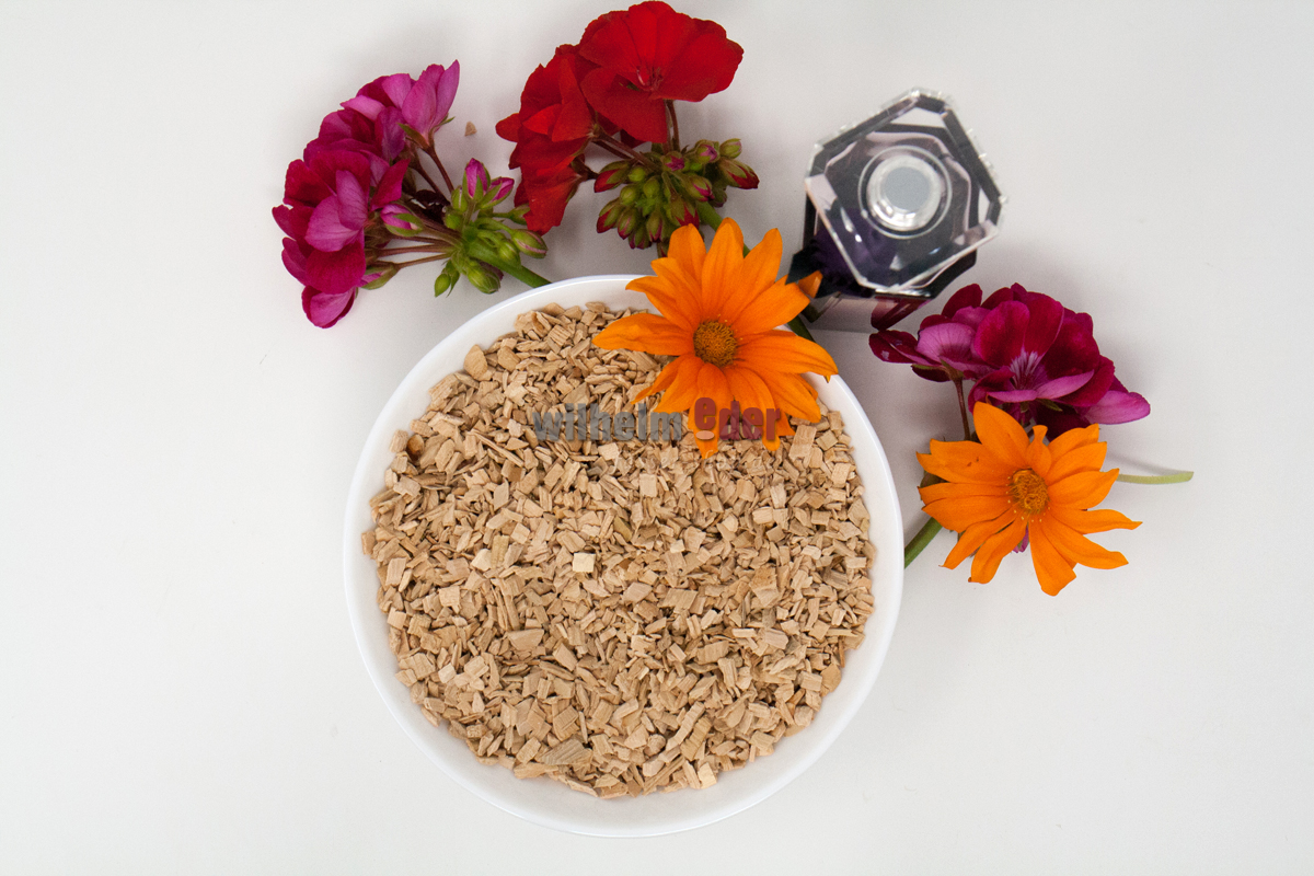 Der Chip wird aus spanischer Cedrela odorata granuliert. Zedernholz ist sehr aromareich und ausdrucksstark im Geruch. Es riecht leicht erdig, waldig und mit einem Hauch von Harz. Das Holz gibt an Ihr Produkt eine feine gold-gelbe Färbung ab.