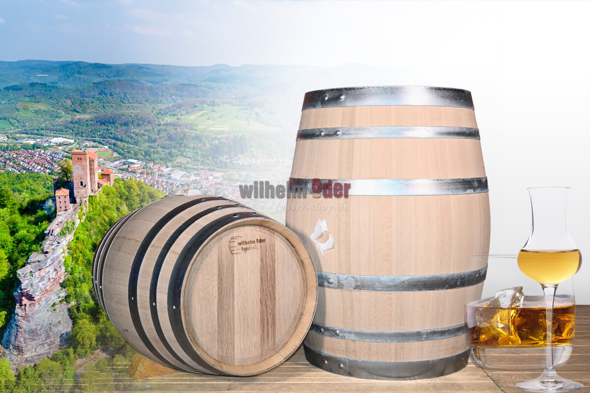 Destillatfässer aus feinporiger Pfälzer Eiche, 24-30 Monate luftgetrocknet. Mit feuerverzinkter Bereifung. Außen roh, innen getoastet.