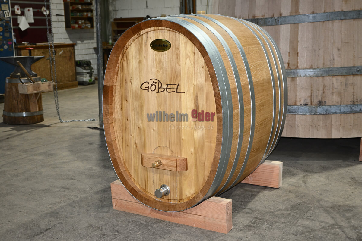 Die Fässer sind standardmäßig mit feuerverzinkter Bereifung und einer Holztür ausgestattet. Sie werden mit Leinöl oder einem klaren, lebensmittelzertifiziertem und atmungsaktiven Lack behandelt (Bitte bei der Bestellung unter "Kommentar" angeben).